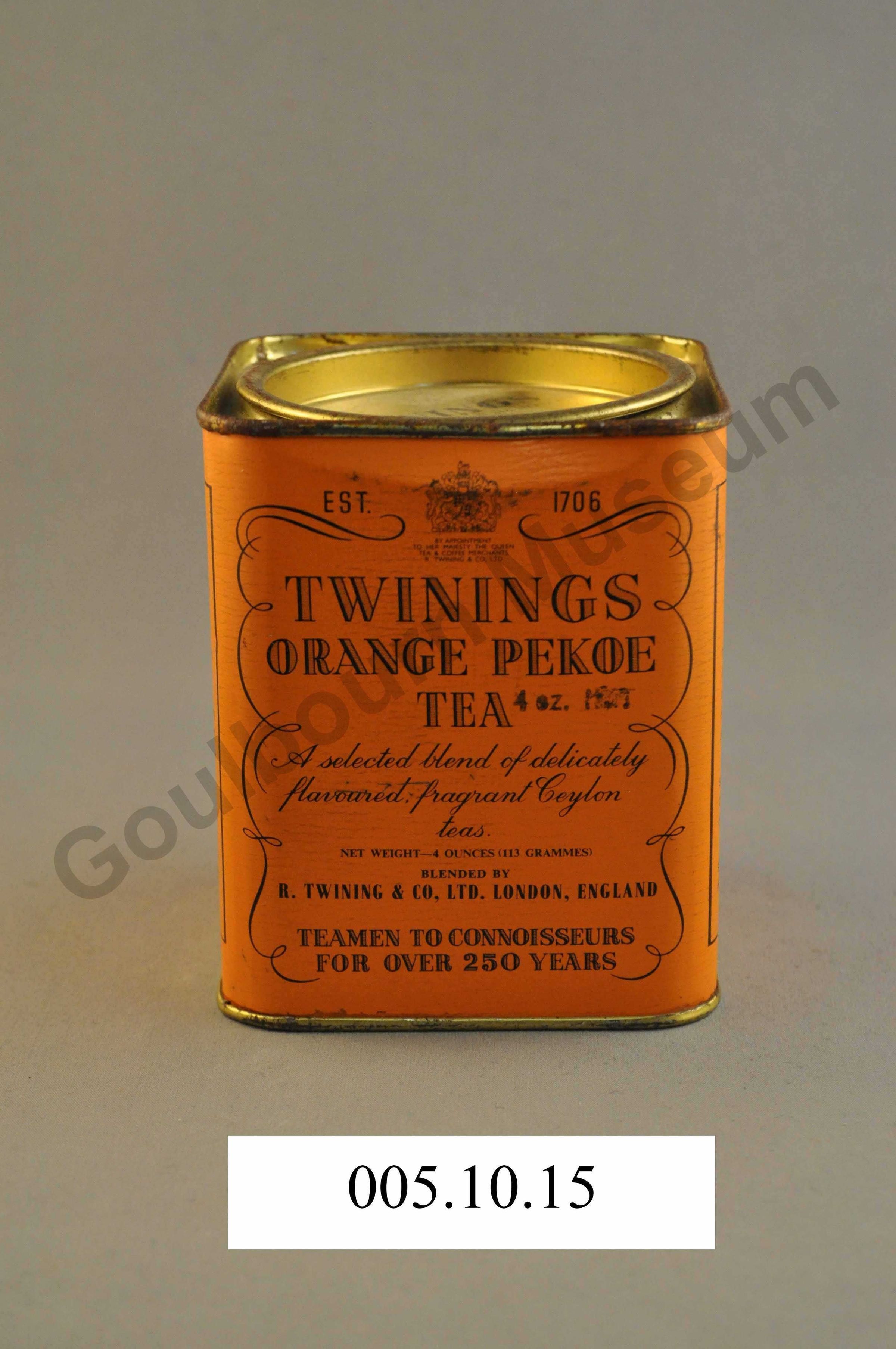 Orange metal tin of Twining's Orange Pekoe Tea.