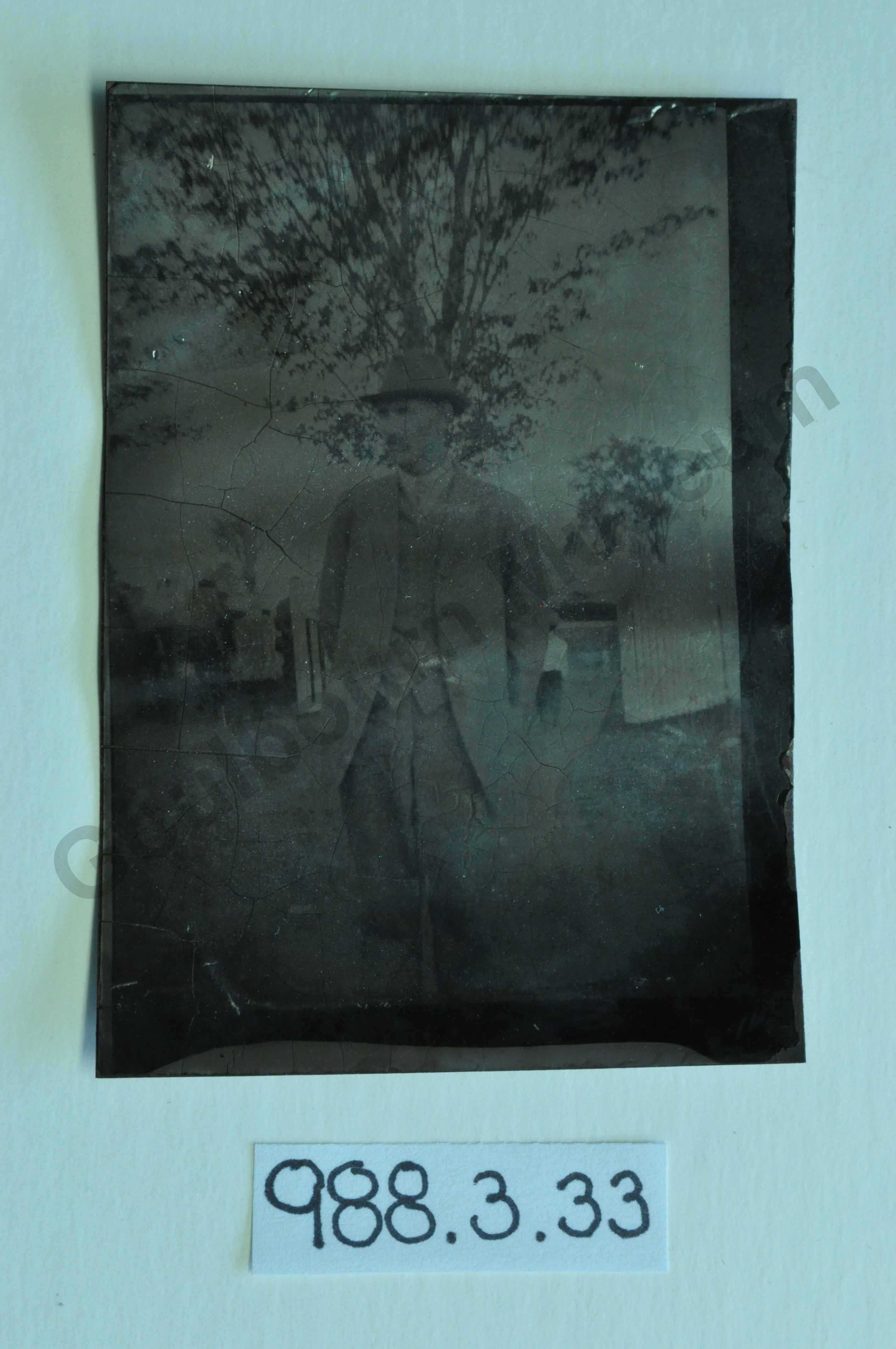 Tintype of a man standing outside. He wears a bowler hat and suit and gazes to the left. A tree appears behind; a group of people can be seen at the left. Cracks are discernible on the surface; warping also evident.