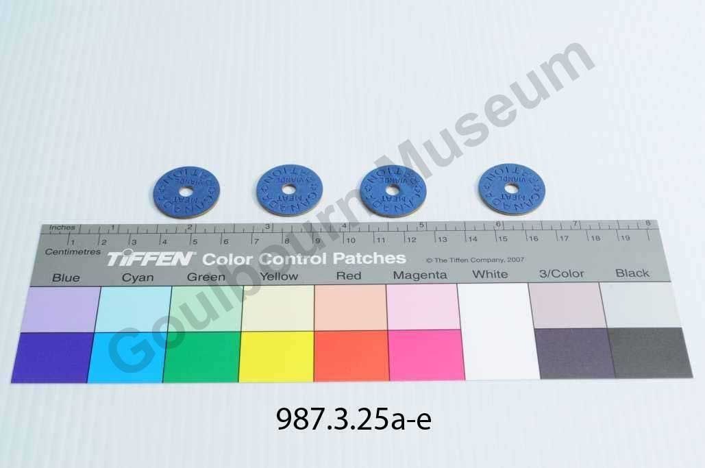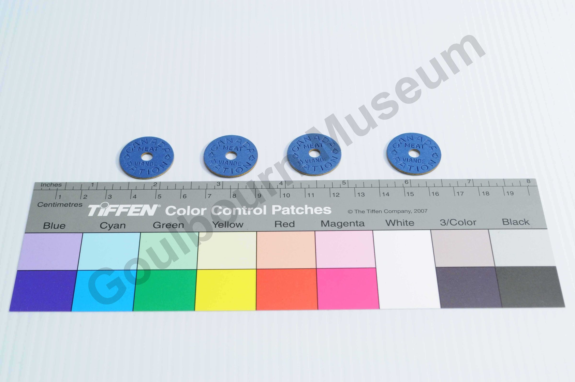 Five circular tokens that are blue in colour. Each token has a center hole. There is writing inscribed on the surface of each token stating: CANADA, RATION MEAT, VIANDE. All writing is rendered in capital letters. The words CANADA and RATION are positioned around the edges in an arcing orientation. The words MEAT and VIANDE are located in the center in a vertical orientation with MEAT on top, separated by the central hole. There is a small maple leaf on the left and right sides of the tokens located between the start and end of the words CANADA and RATIONContext