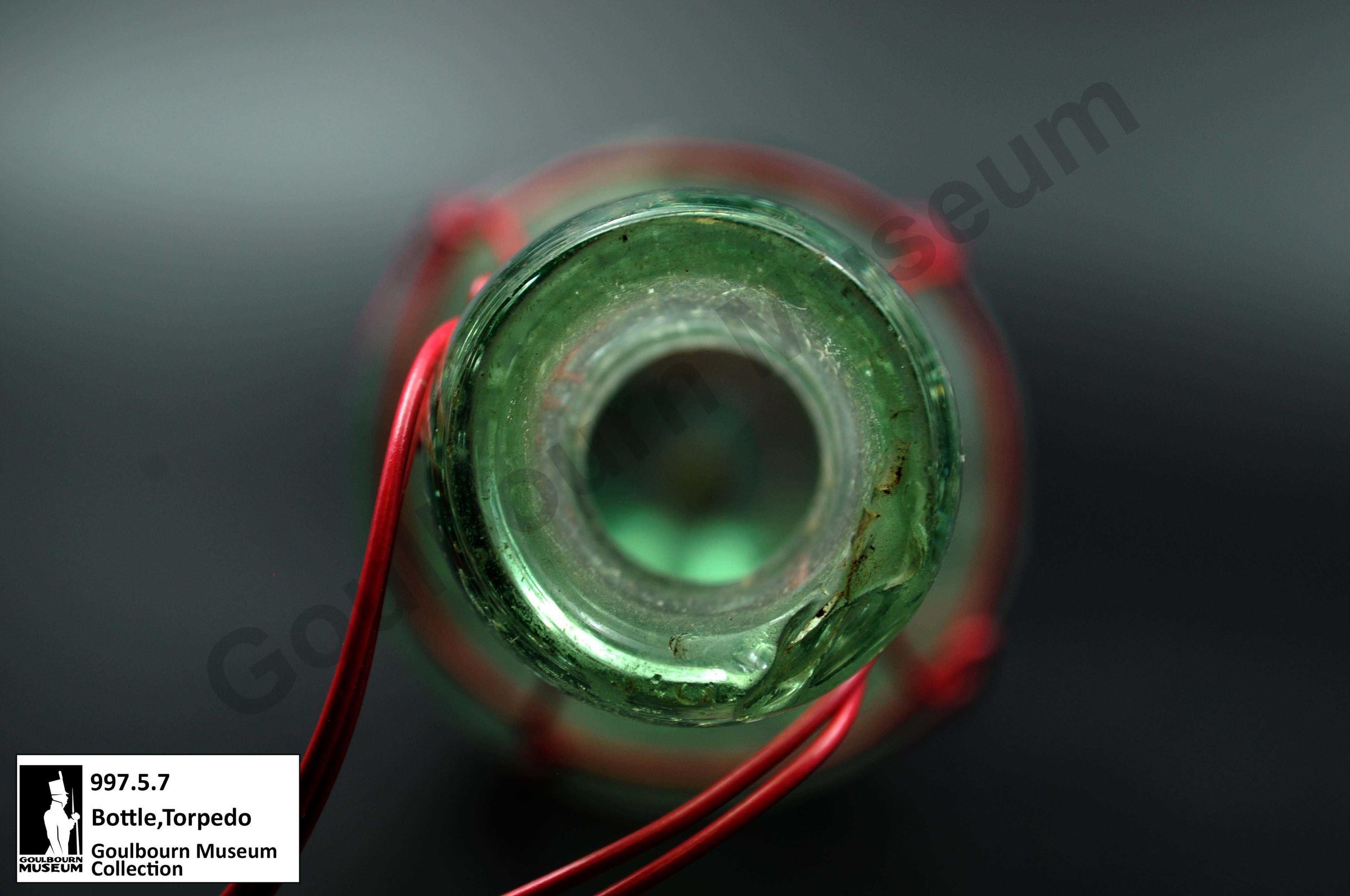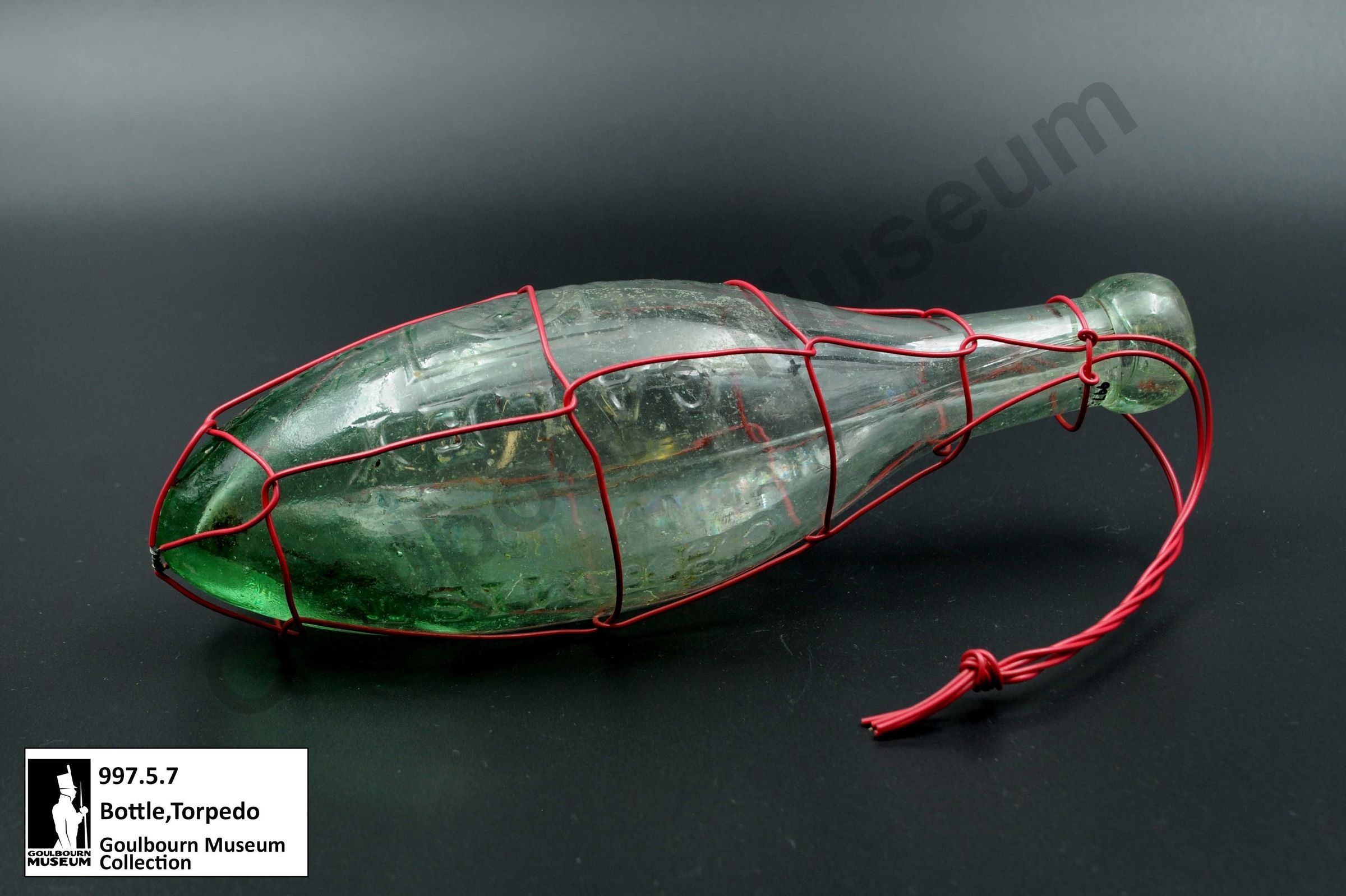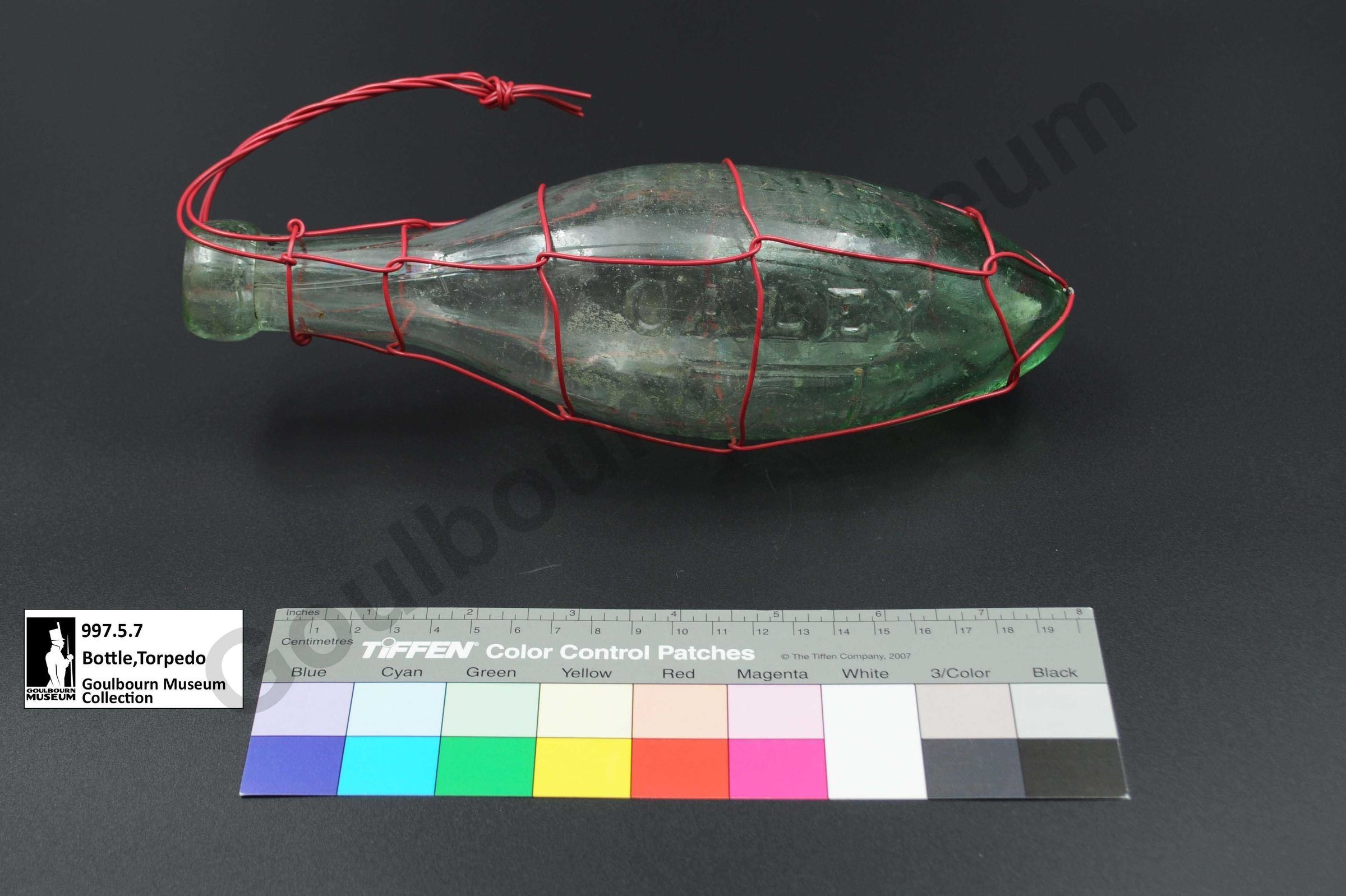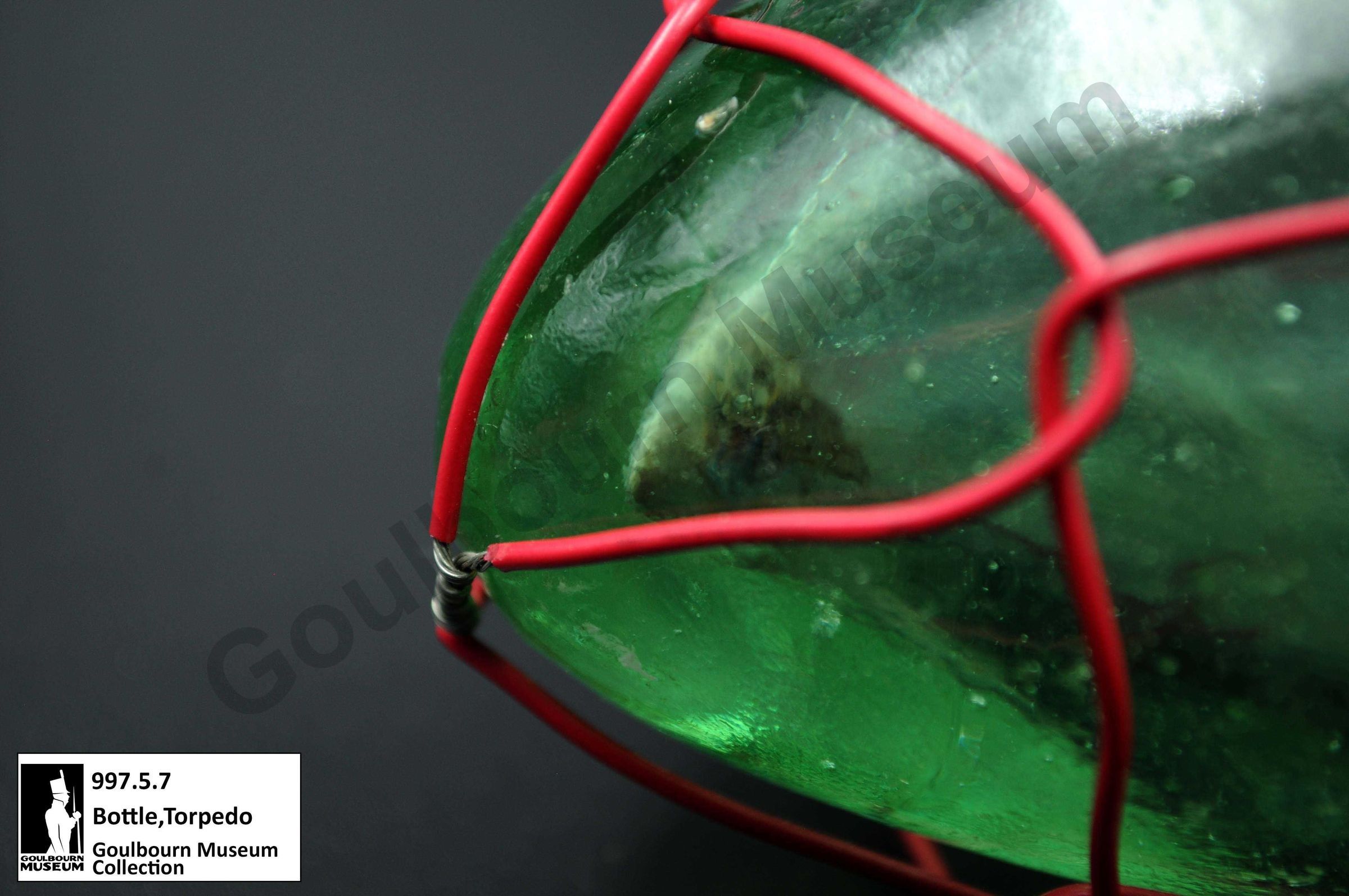 One clear green glass ampoule shaped bottle with chipped rim, raised lettering which reads "Norwich Pharmceotical Chemist CALEY". The base of the bottle is rounded making the bottle sit on its side. Wrapped around the bottle is a red wire net.