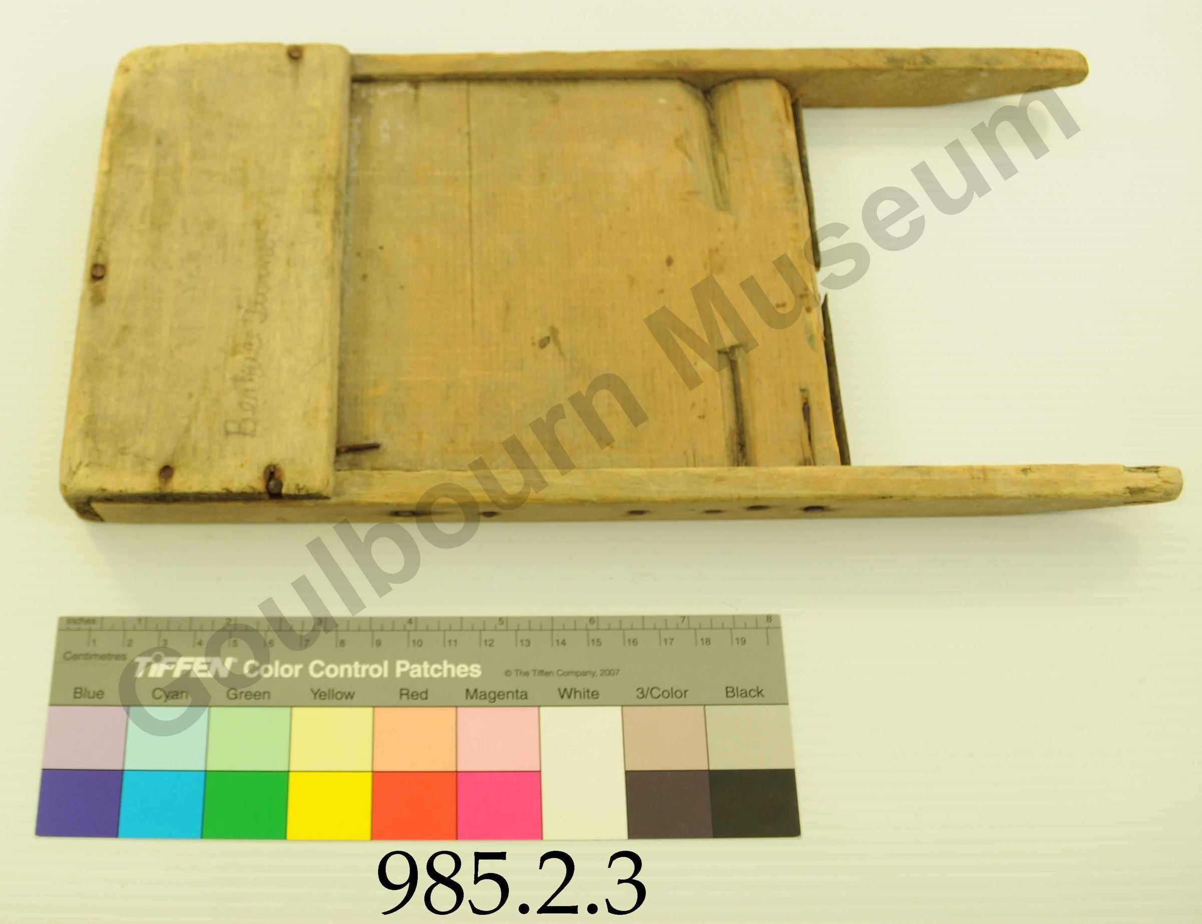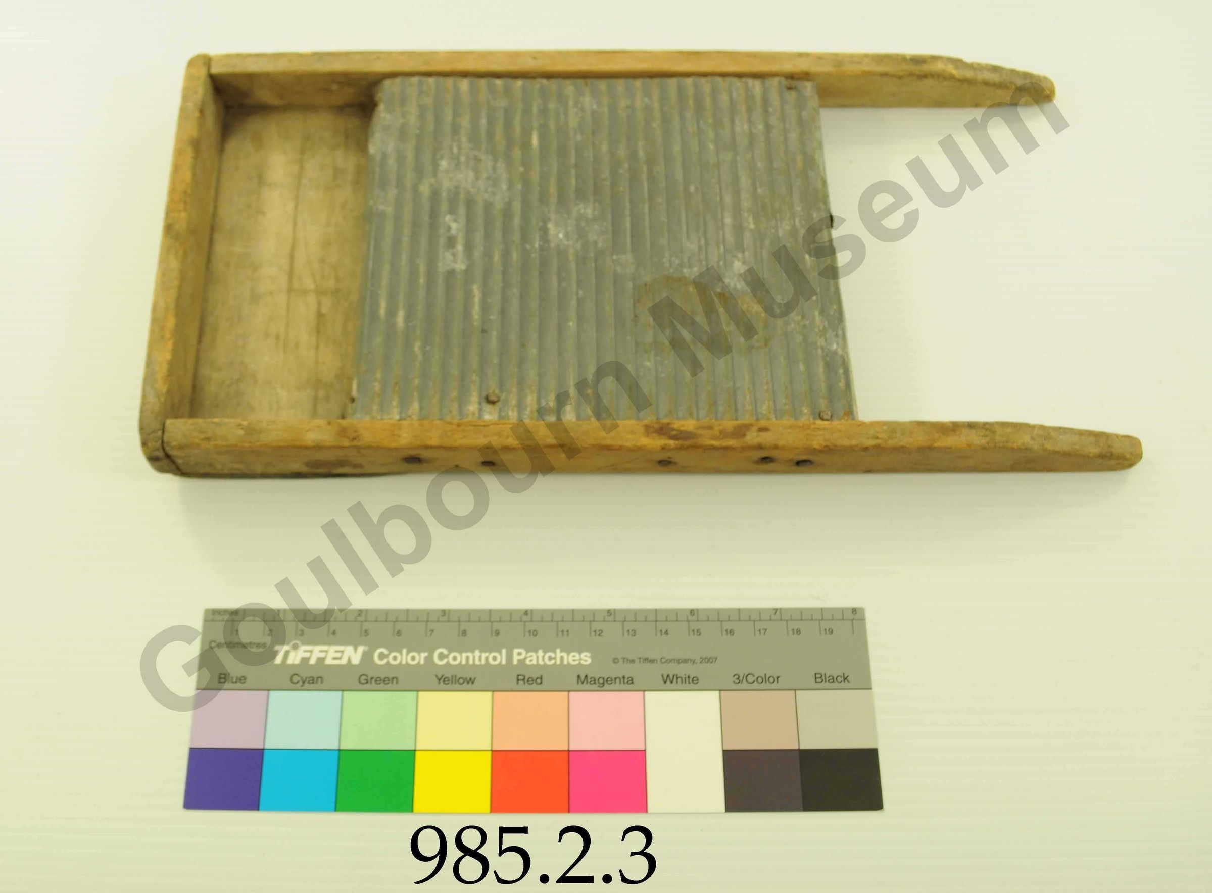 The object is a small wooden washboard that is brown, beige and silver in colour and rectangular in shape. It is composed of components of wood and corrugated metal. On the back side there is printed lettering stating: Beatrice Turner. There are several nails that are visible from the outside that hold the wooden pieces and corrugated metal together.