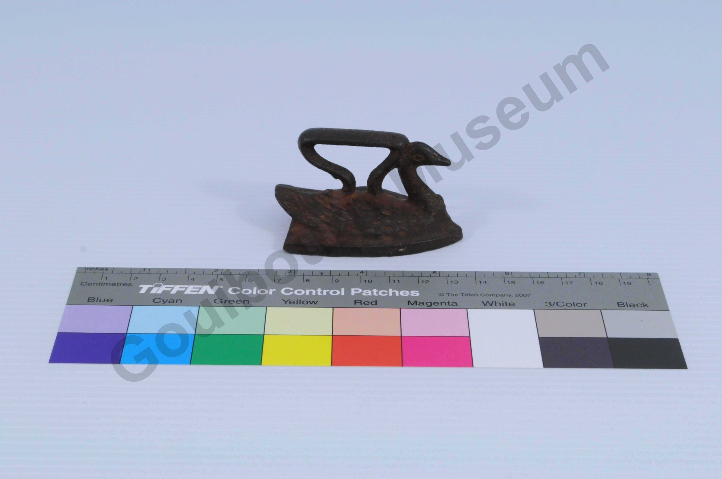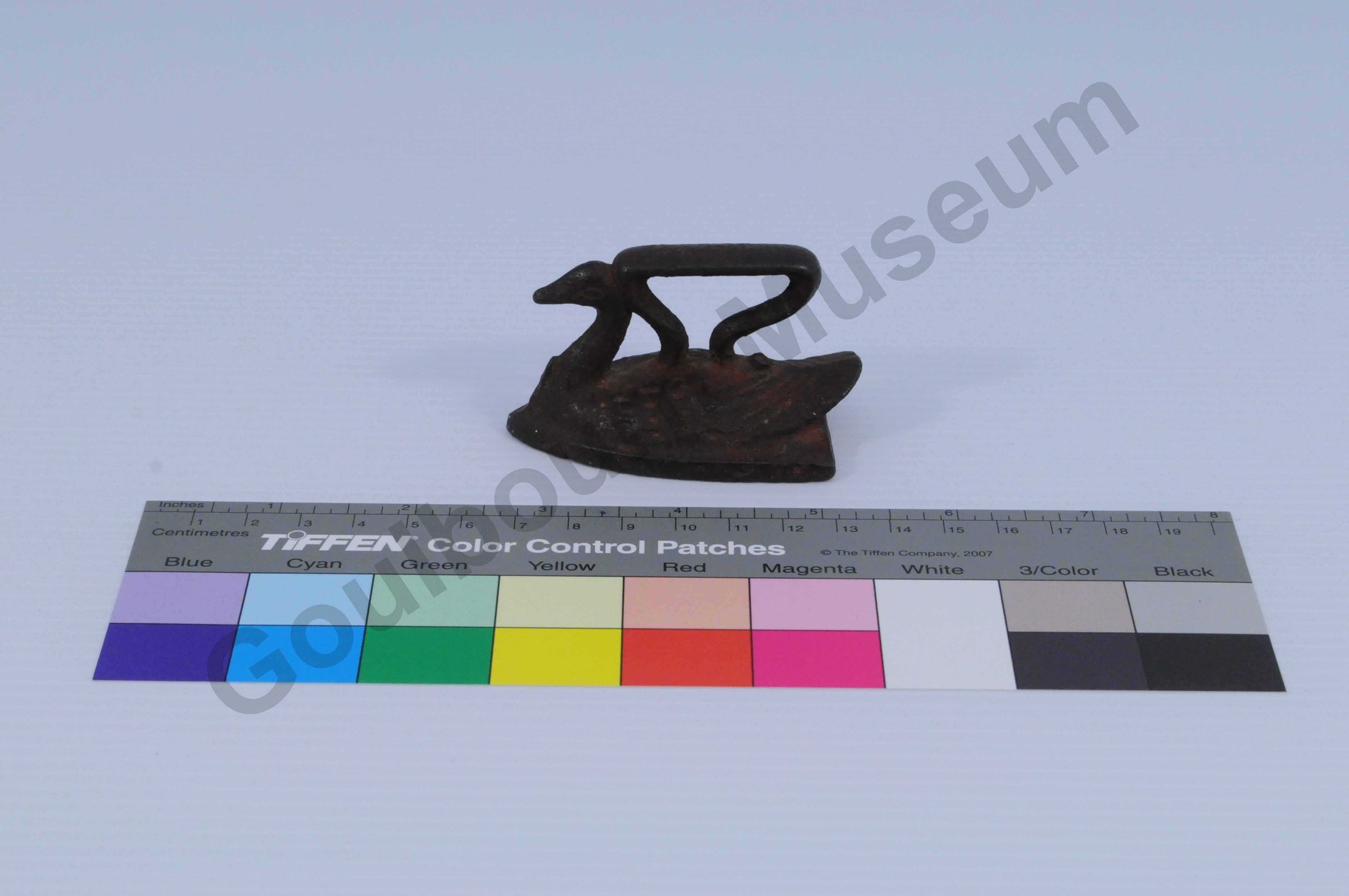 Small toy sad iron. The iron body is cast in the shape of a bird (swan) with the handle protruding and attached on top to the back of the bird.Collection