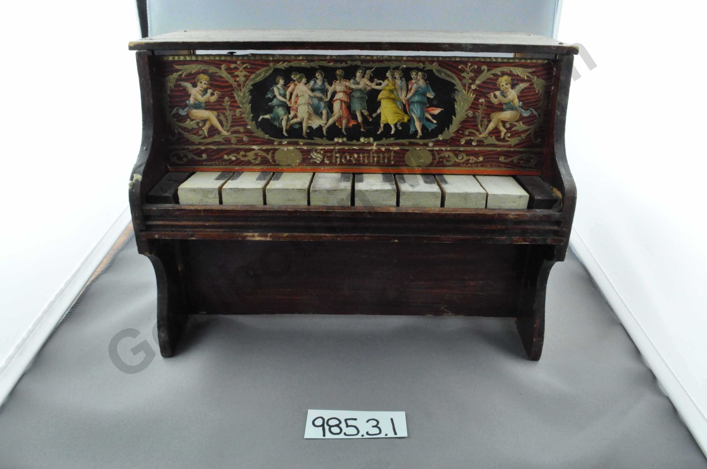 Toy Schoenhut Piano (USA). Dark stained veneered wood body, painted keys, metal nails, metal plates, decal on front with flute playing cupids and dancing angels. Has been in Mrs. Thompson's family throughout her life.Lexicon