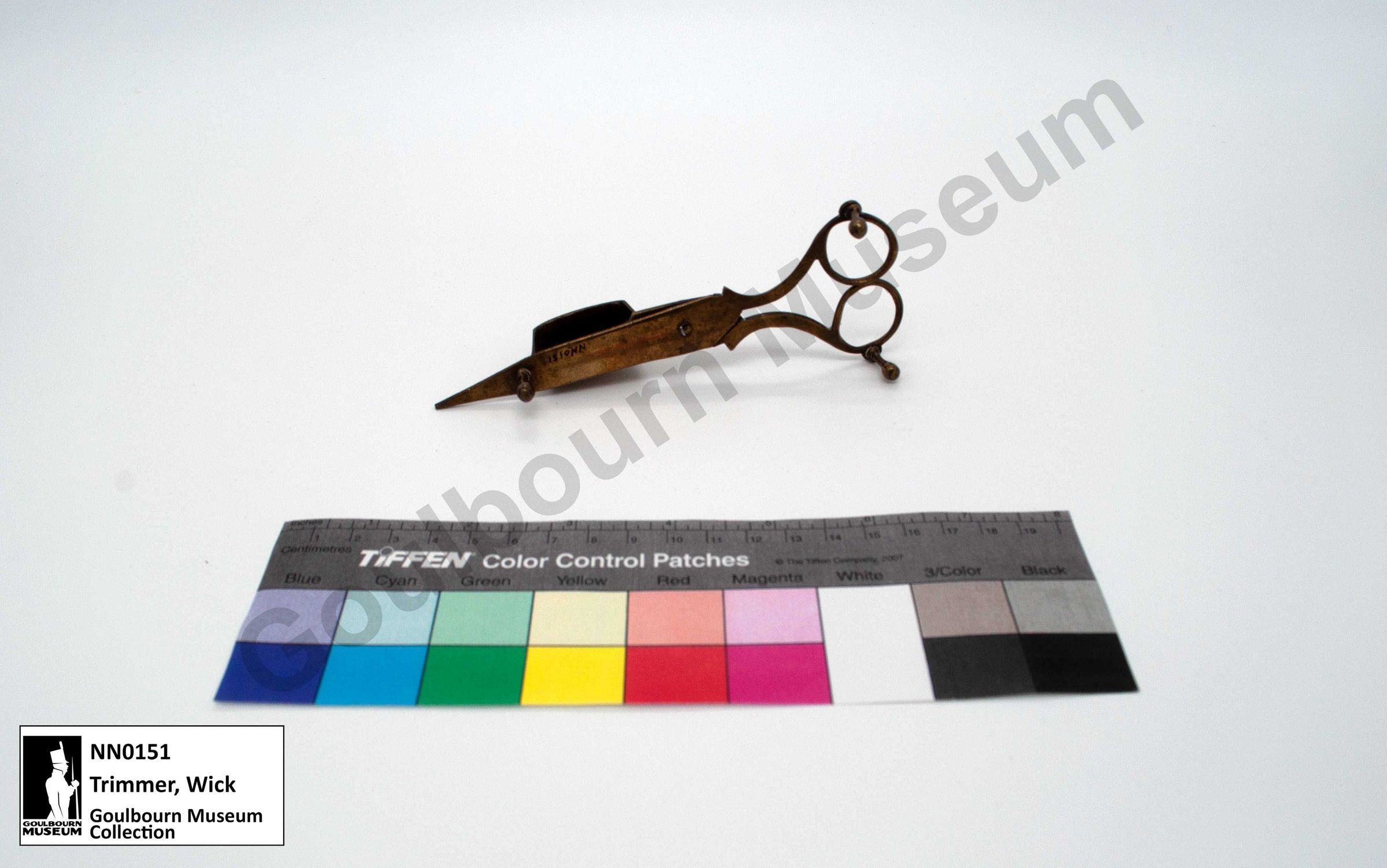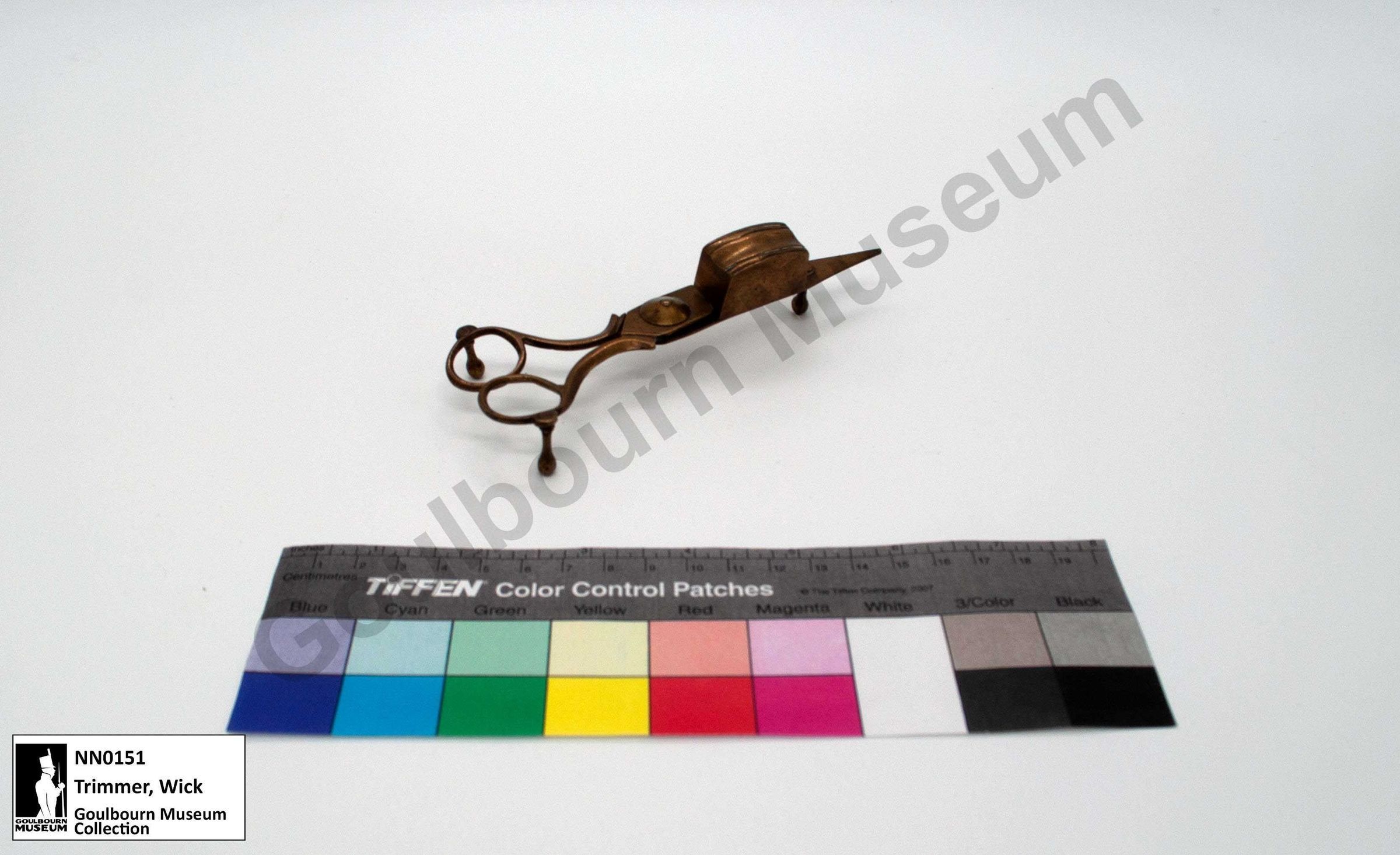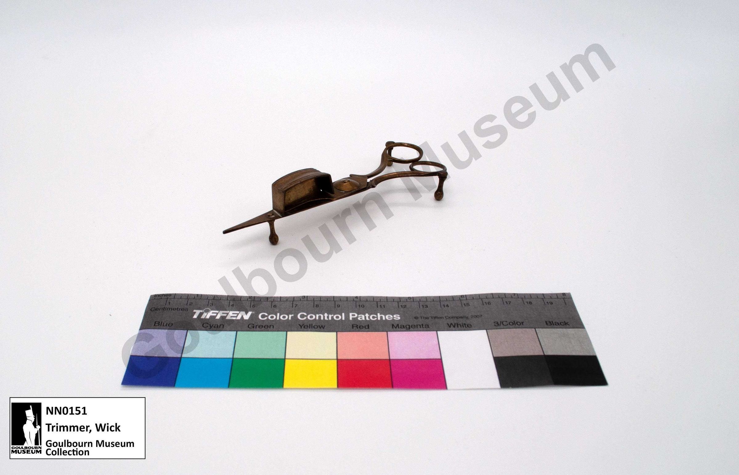 Brass wick trimmer, appear like decorative scissors resting on three small pedestals on base. Raised container shape on "blade", with panel that would close to snuff the candle. Four small incised lines on top of container shape.