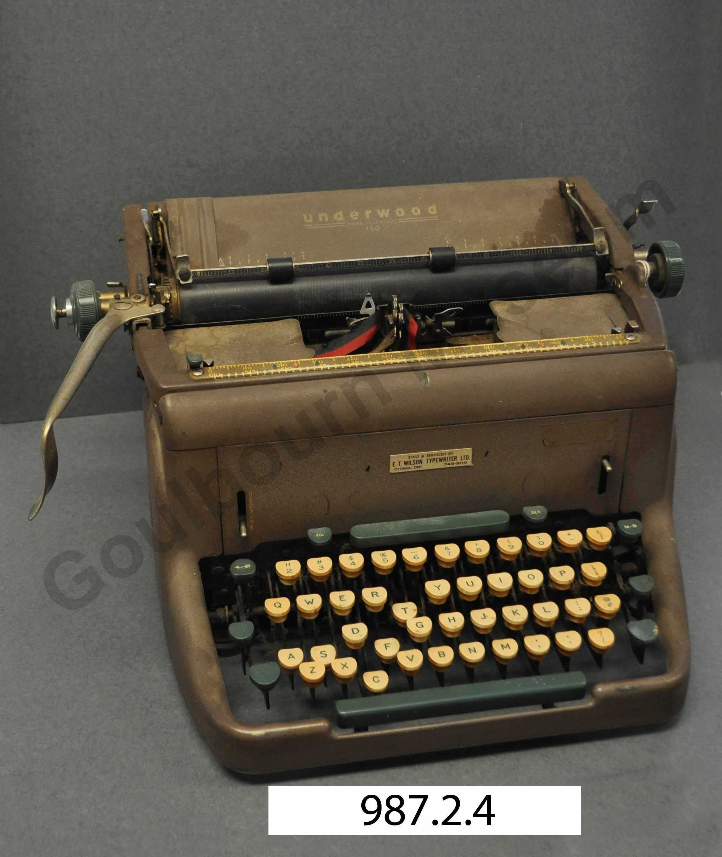 One brown rectangular Typewriter with green and white plastic components. The Keys in the front have letters, numbers and symbols in the same placement as modern keyboards. The Top of the typewriter is marked with inches to line up the paper. There is also an opening that allows the user to view the letter imprints move to the page. Underwood 150, manual, made in Canada.Collection