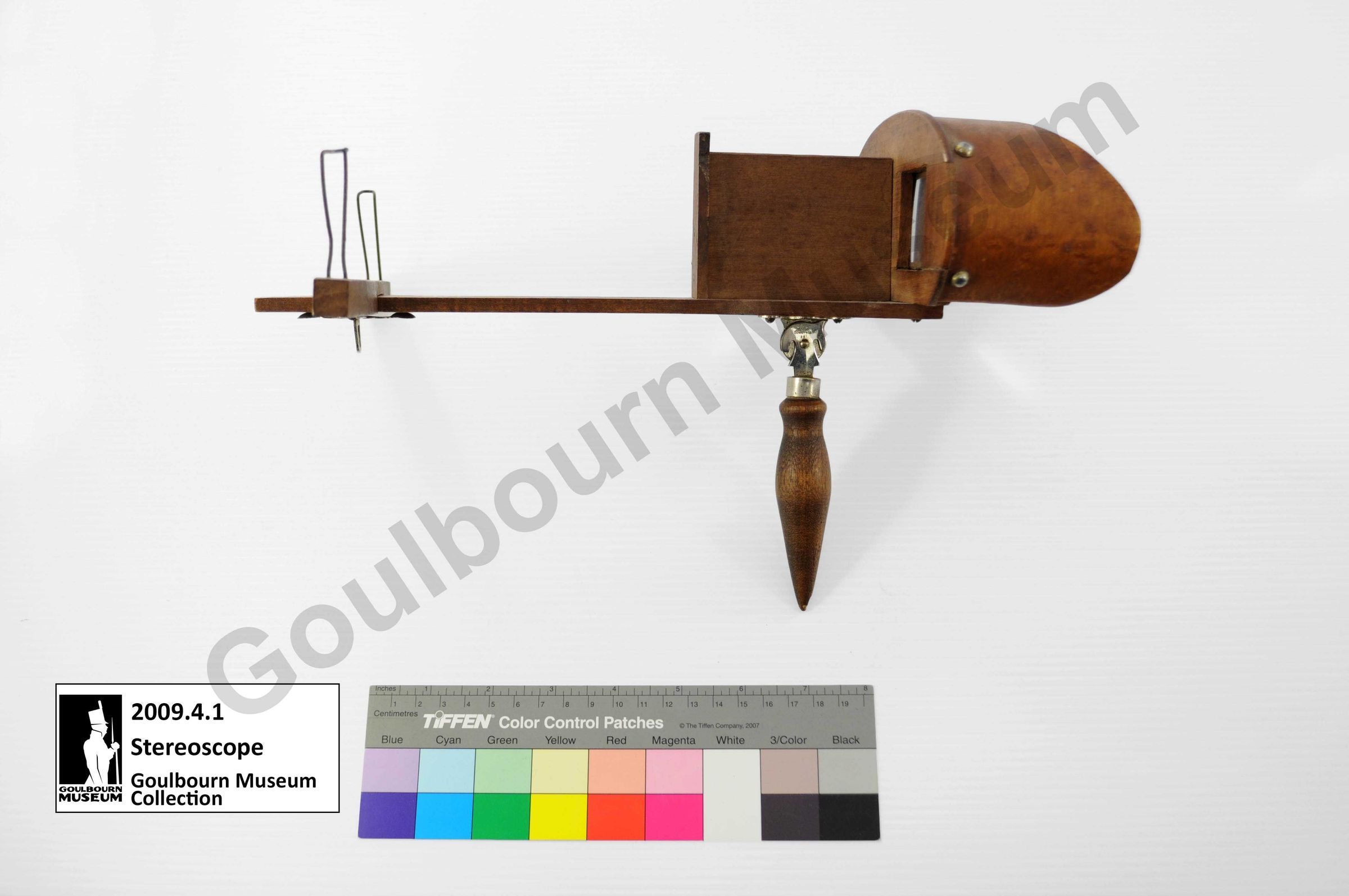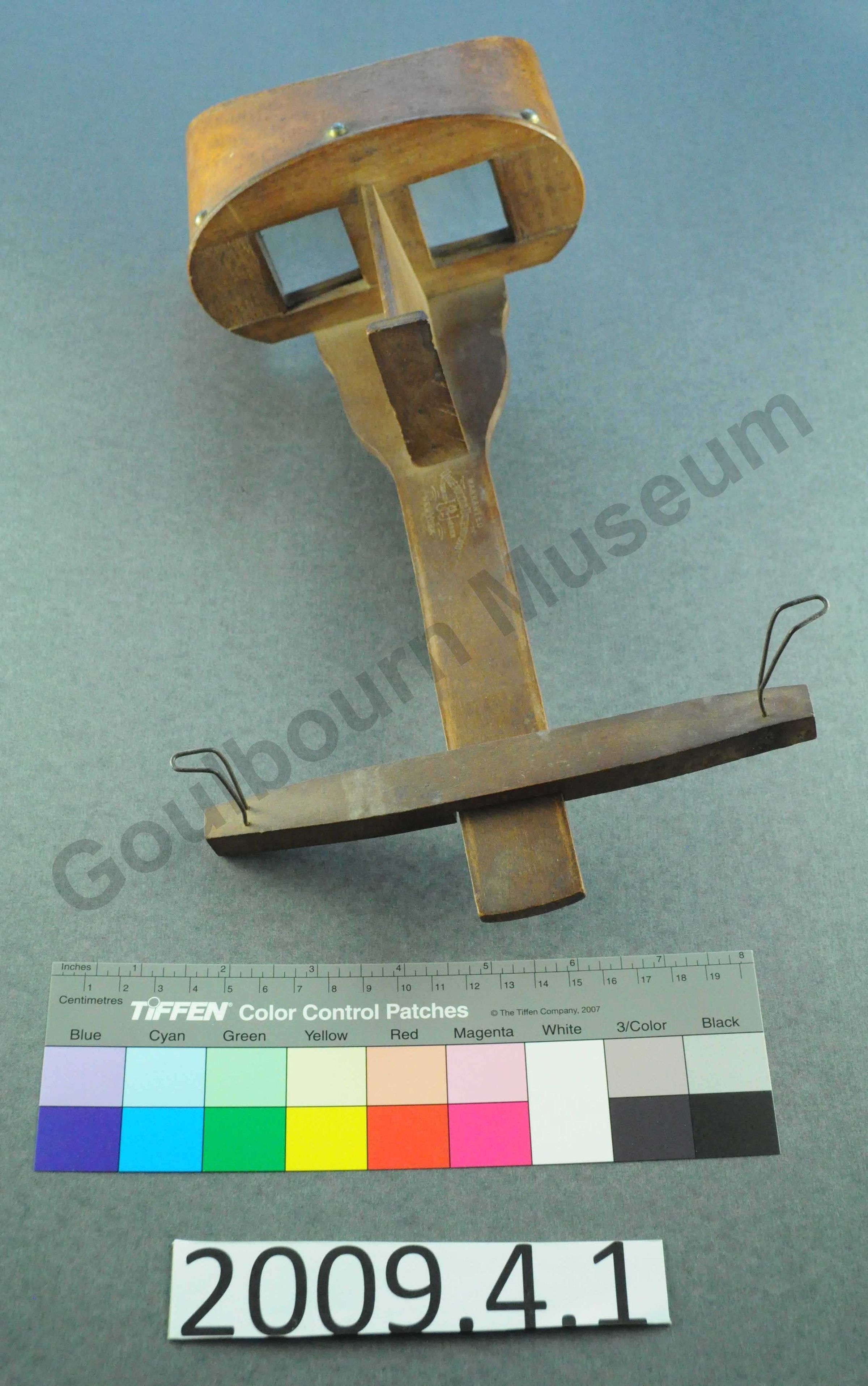 One stereoscope, brown wood. Stamp on top Warranted Underwood and Underwood Trademark New York. Metal fastener allow for handle to fold down. This item was donated along with a box of stereoscope cards accessioned as 2009.4.2a-k.Context