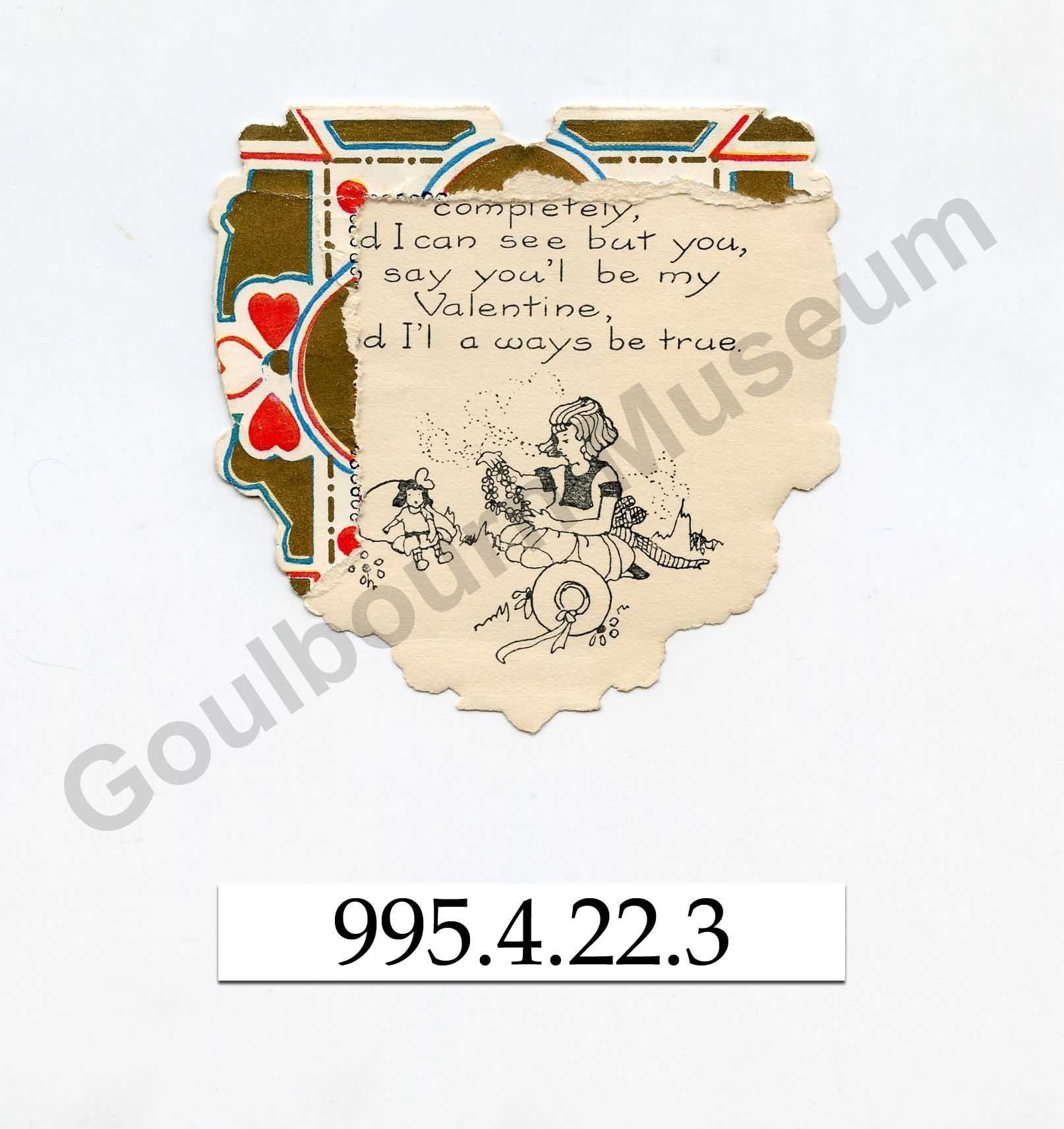One paper Valentine greeting card, folded in half, in the shape of a heart. The front of the card is damaged with a large area of loss, it was originally decorated with a white, gold, blue and red geometric motif. The inside of the card reads, "You've won my heart completely, And I can see but you, So say you'll be my Valentine, And I'll always be true. "The reverse preserves an inscription, "Isabel from the teacher" along with a maker's mark, "Whitney Made. Worcester Mass. Made in U.S.A."Context