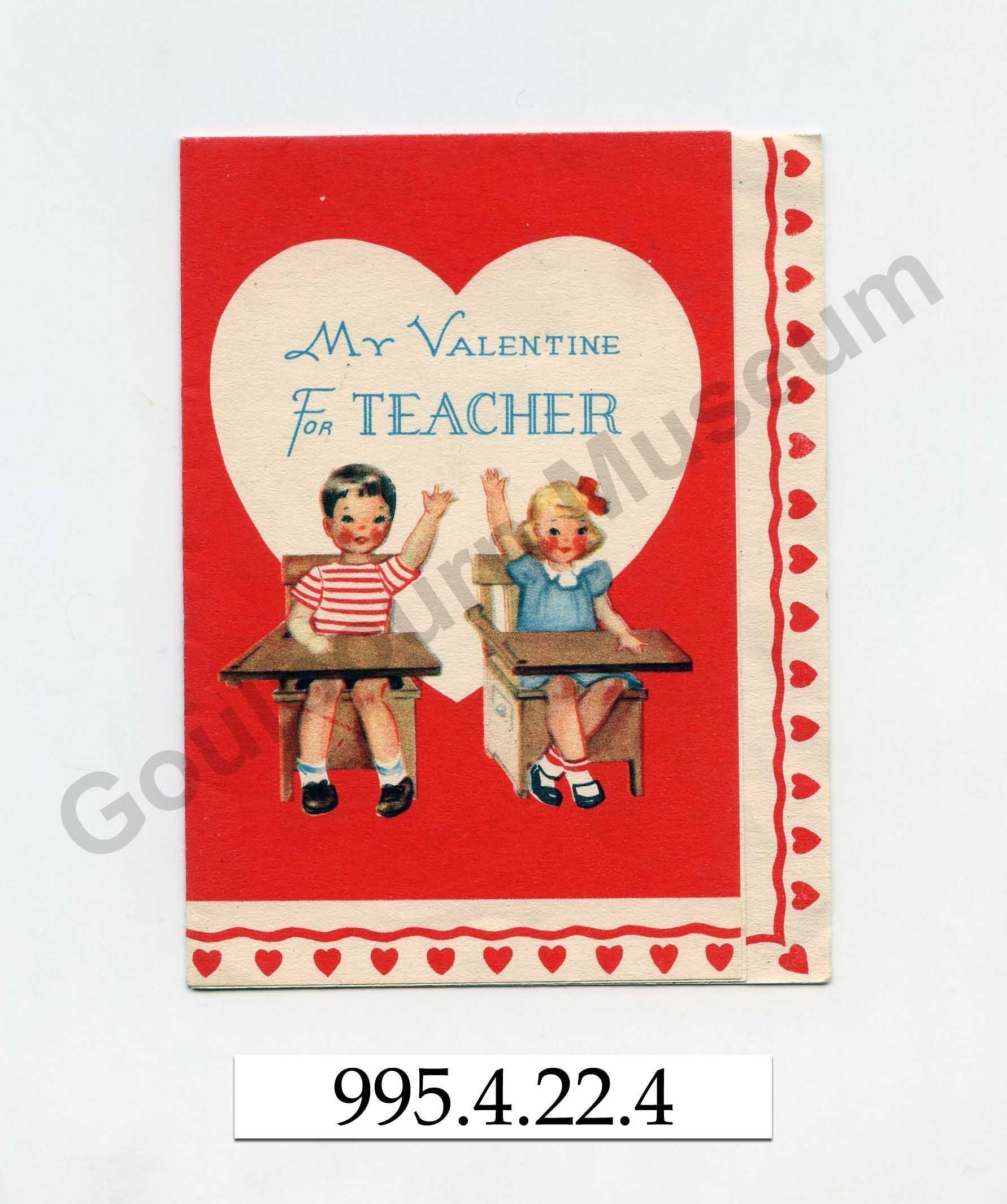 One paper Valentine greeting card, folded in half horizontally and again vertically. The front of the card is decorated in red with a large white heart outlining two young students sitting at school desks with their hands raised. Text on the front of the card reads, "My Valentine for teacher." Inside the card the two children are depicted holding a red and white heart with the text, "You're a Teacher I admire In such a special way I've sent this Valentine to you To wish you joy today!" The card is signed in black ink, "Gwendolyn, Helen and Dorothy." The reverse of the card is blank with, "Made in Canada" written in blue ink along the bottom.Context