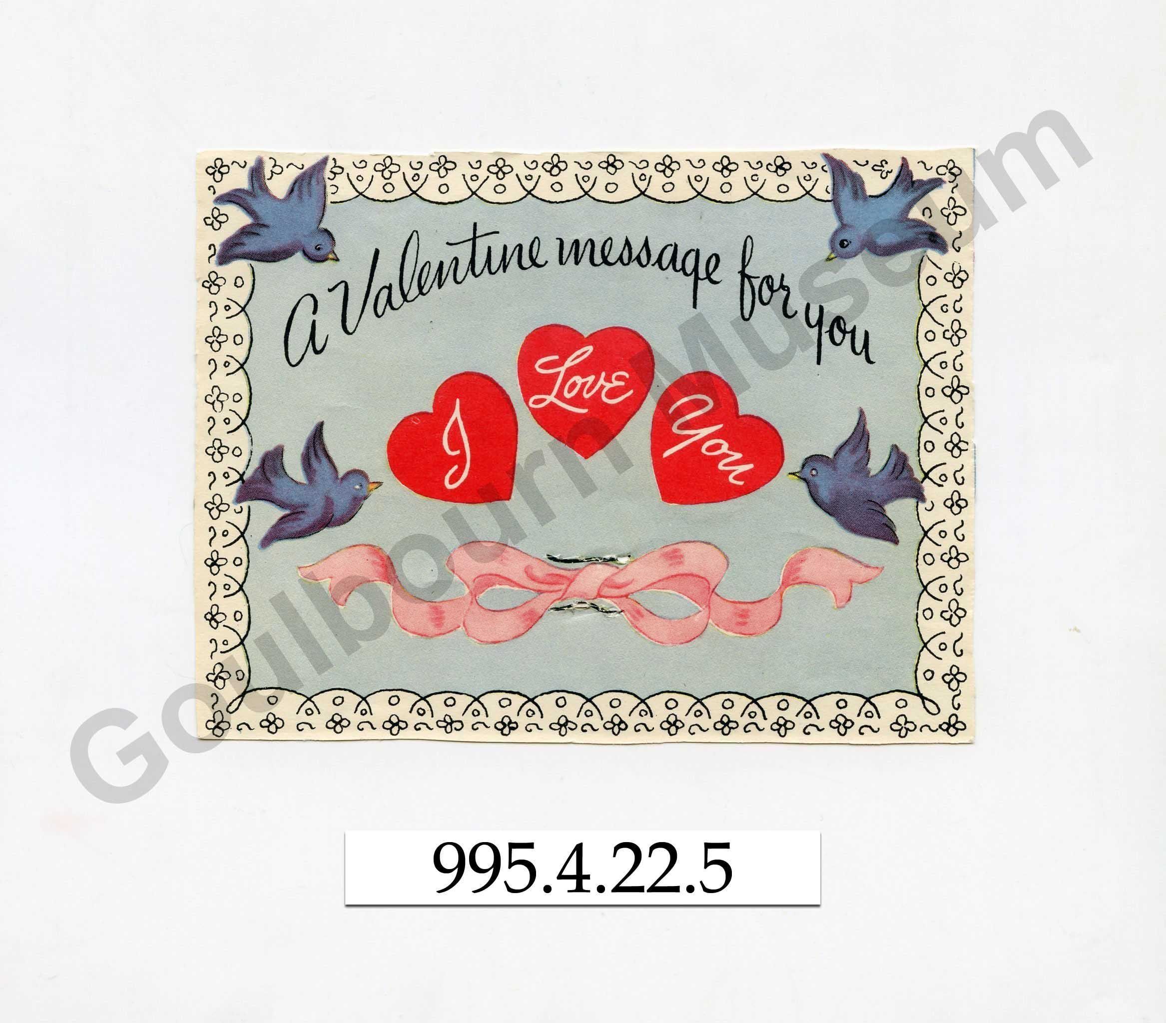 One paper Valentine greeting card decorated with four blue birds, a floral border, pink ribbon tied in a bow, and a message, "A Valentine message for you" with "I Love You" featured in three red heart shapes. On the reverse in blue ink is inscribed, "To Miss Gamble. From Mildred Paul."