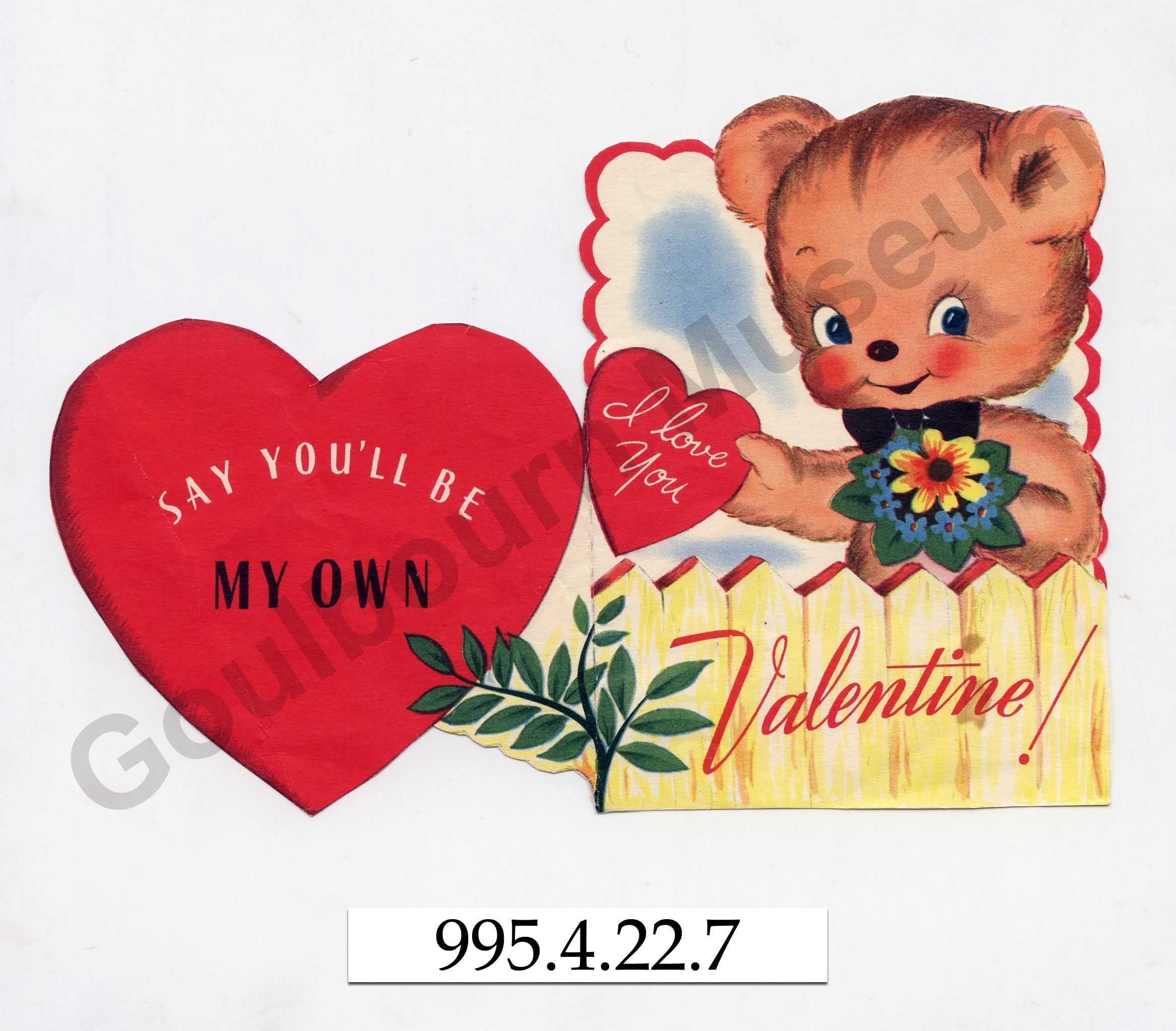 One paper Valentine greeting card decorated with one large heart with the text, "Say You'll be My Own" on the left and a brown bear dressed in a bow tie, holding a bouquet of flowers and heart with the text, "I Love You," while standing behind a wooden fence displaying the word, "Valentine!" on the right. On the reverse of the card written in graphite pencil is the message, "To Miss Gamble from Meirlyn W."Context
