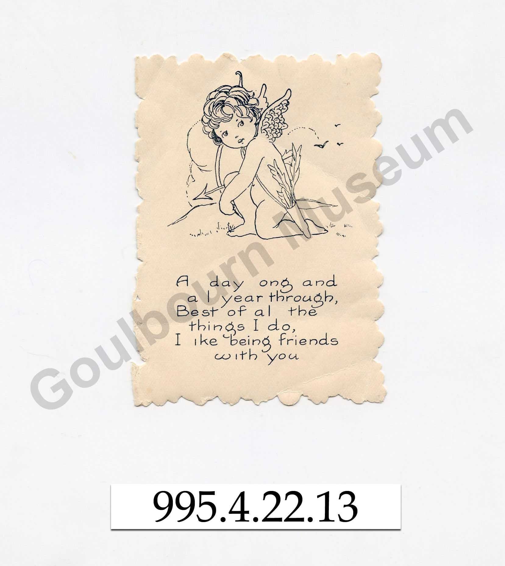 One paper greeting card with the message "All day long and all year through, Best of all the things I do, I like being friends with you." The card is decorated with the black and white drawing of a cherub holding a bow and arrow. The card originally would have been folded in two with a decorative front cover, which has been removed. Reverse of the card has a handwritten name, "Isobel C" and a makers mark, "Whitney Made Worcester Mass. Made in U.S.A."