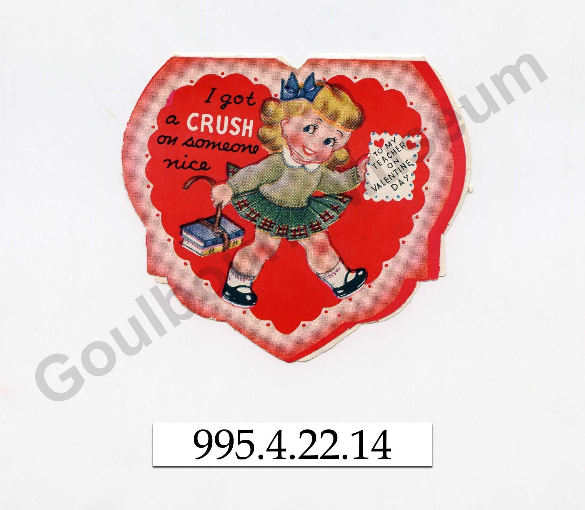 One folded paper greeting card with the message "I got a CRUSH on someone nice," decorated with the image of a young school girl holding a card that says, "To my teacher on Valentine Day." The card is decorated in a red and white border. Inside the card is a black and white floral design on the top, on the bottom is the message, "Don't MISS this question - Will you be my Valentine?" The card is signed in black ink, "From Elmer V." On the reverse of the card in black ink is written, "Miss Gamble."Context