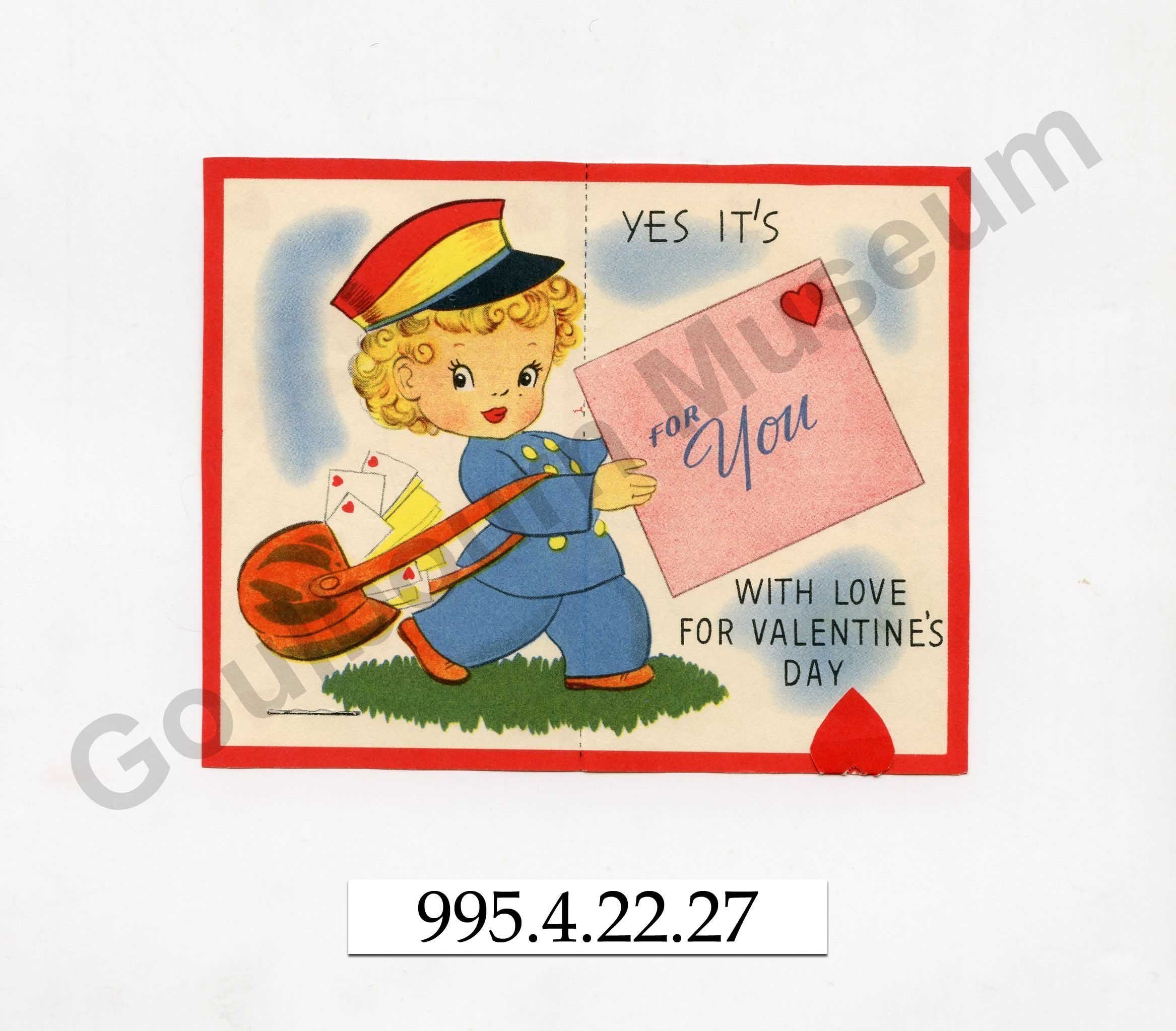 One folded printed colour greeting card with the message, "For You" and decorated with a red floral and heart design on the front cover. Inside of the card a colour image stretches across both the left and right sides. The image depicted inside the card is of a young child dressed as a postal carrier, holding a large pink envelope. The message inside of the card reads, "Yes It's For You With Love For Valentine's Day." On the reverse of the card is a hand written note in graphite pencil, "To: Miss Gamble," "From Muriel J."