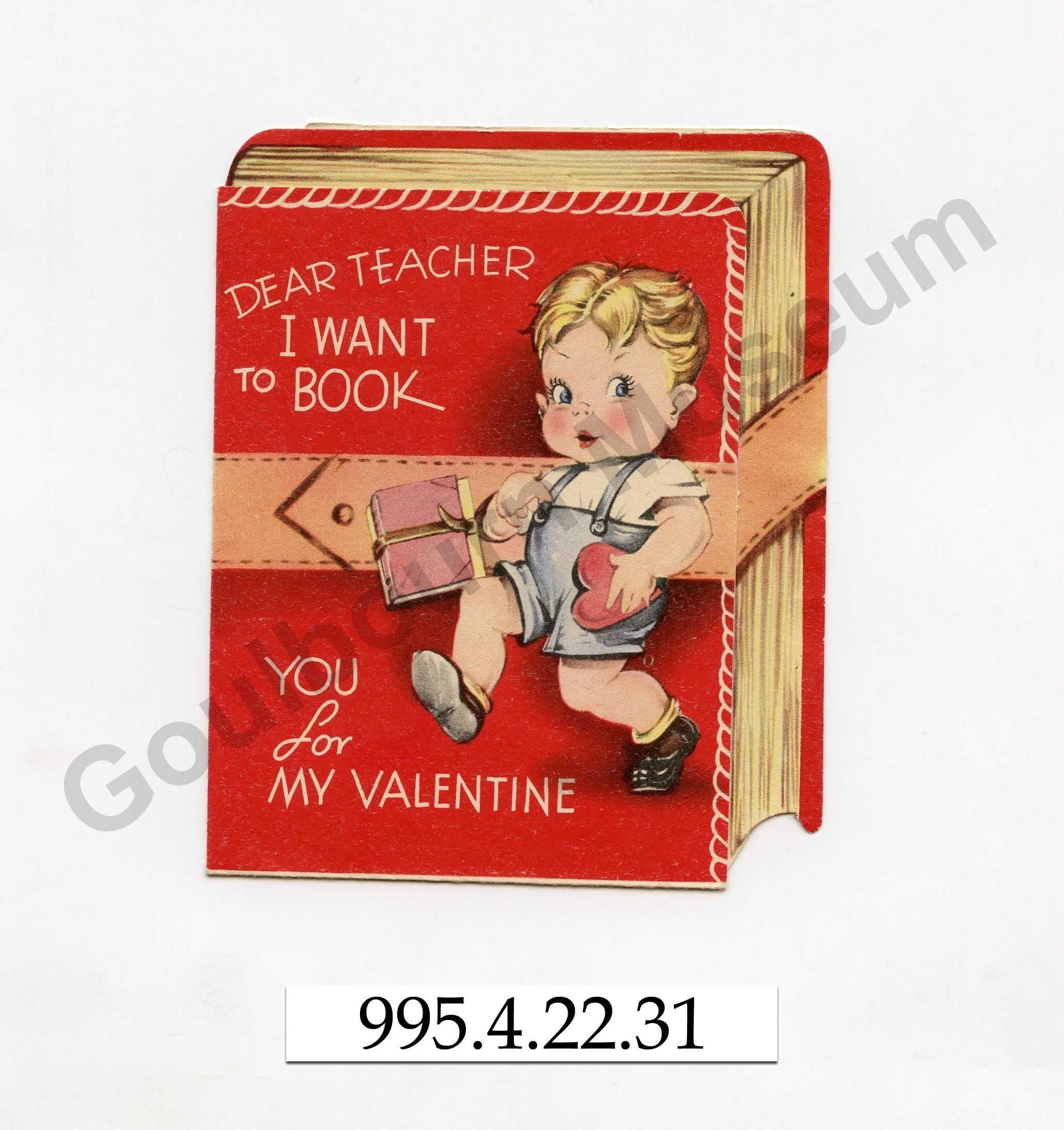One folded printed colour greeting card with the message, "Dear Teacher I want to book you for my Valentine." The card is decorated like a folded red book, with a young school boy in blue shorts depicted on the cover. Inside of the card is depicted the young boy holding a heart shape cutout alongside a school slate board with the message, "You are slated to be my Valentine." Along the bottom of the card, written in graphite pencil is, "Keith Vig."