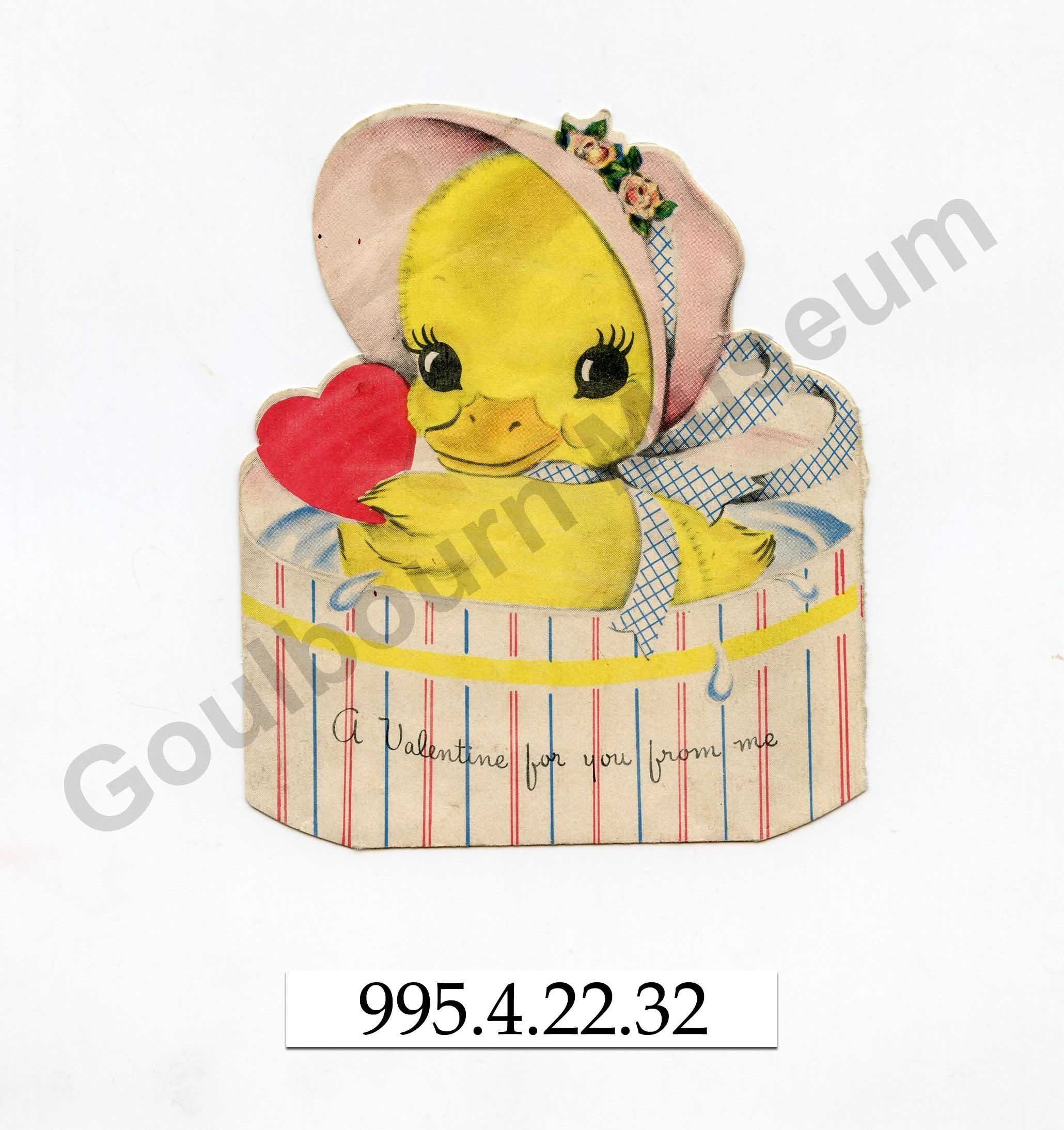 One folded printed colour greeting card with the message, "It's Valentine's Day" and the image of a duck, wearing a bonnet and holding a cutout of a heart on the front cover. Inside of the card is a message hand written in graphite pencil, "Alice Gartz." On the reverse of the card there is another image of a duck wearing a bonnet and holding the cutout of a red heart shape with the message, "A Valentine for you from me," recorded below. The card is folded in two along the bottom edge.