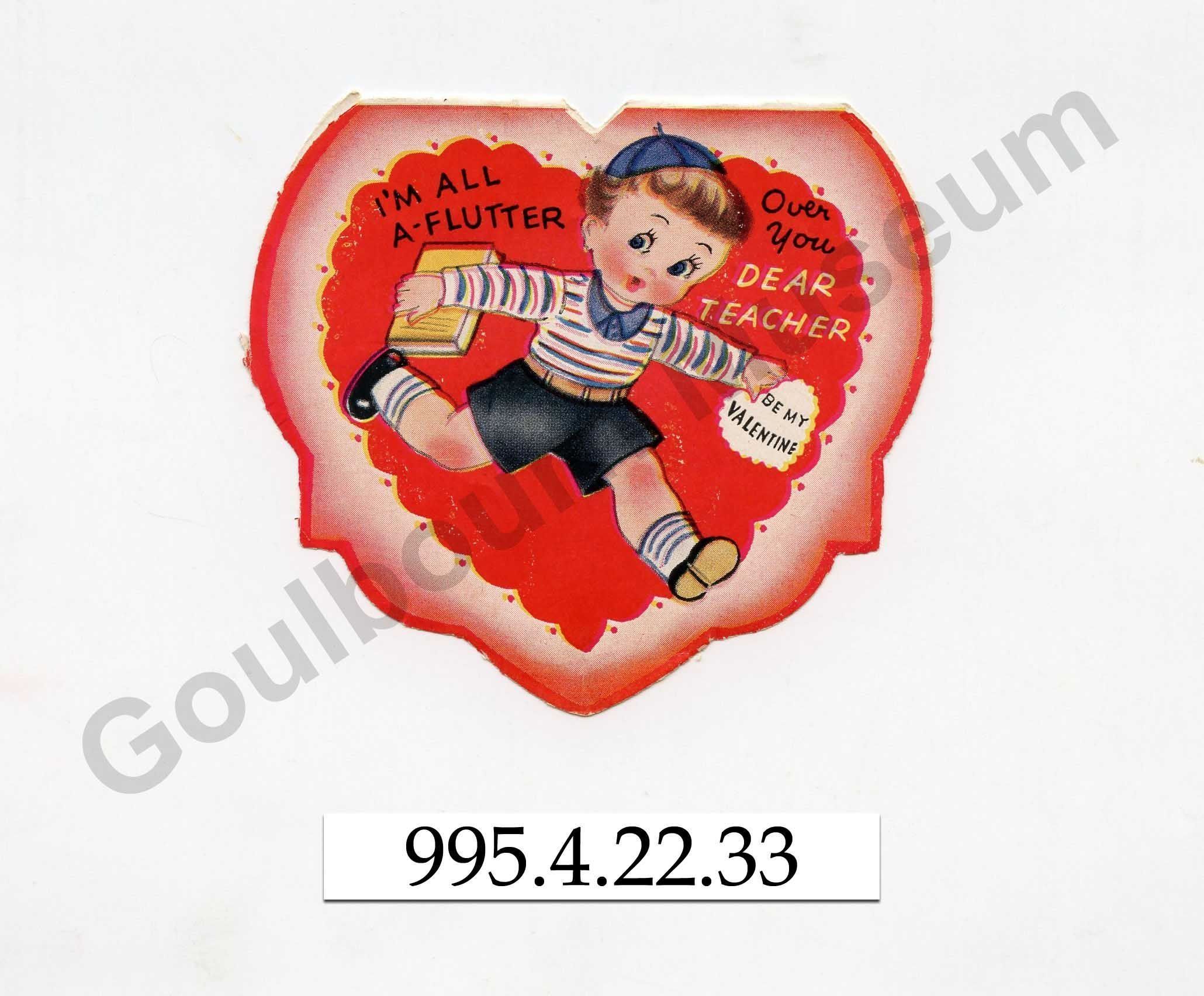 One folded printed colour greeting card with the message, "I'm all a-flutter over you DEAR TEACHER," and the image of a young school boy on the front cover. Inside the card on the top there is a black and white floral and heart decoration and on the bottom is the message, "I'm running out of words to say "Please be my Valentine" and "From Dennis." On the reverse of the card is written, "Miss Gamble."