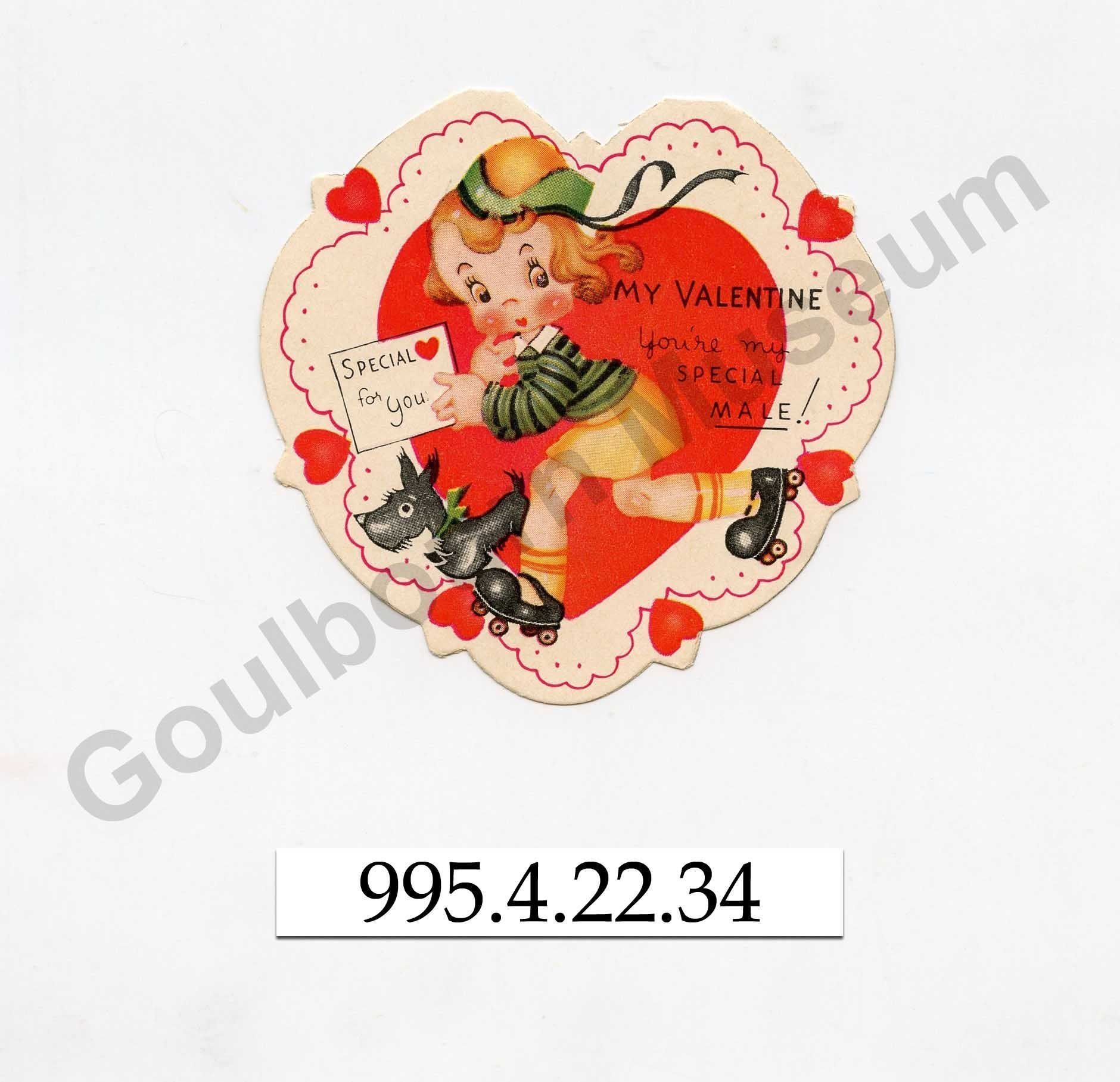 One folded printed colour greeting card with the message, "My Valentine You're my SPECIAL MALE!" and the image of a young child in roller skates with a black coloured dog on the front cover. Inside the card is the message, "and I think - W - E - L - L. I think you're 'SWELL'." On the reverse of the card written in graphite pencil is, "to teacher from Gordon P." On the bottom of the reverse of the card is a manufacturer's mark, "A.C. CO. Product of U.S.A."
