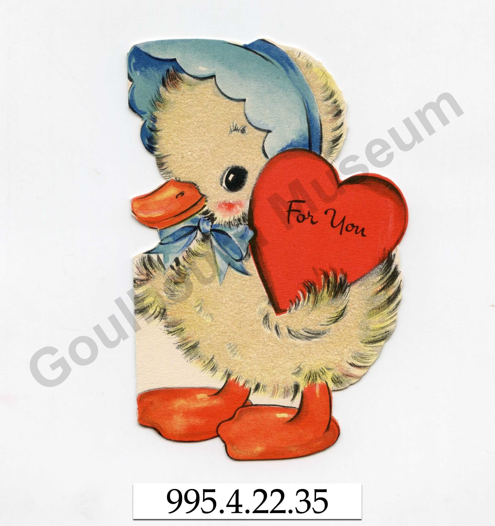 One folded printed colour greeting card with the message, "For You" and decorated with a duckling, made with a furry yellow coloured fibre on the surface of the card, wearing a blue bonnet and carrying a red heart shaped cutout. The inside of the card has a black and white depiction of the duck on the top with the message, "This Valentine Has come today To say you're nice In every way." At the bottom of the card is written, "from Alberta M. Burns." On the reverse of the card there is a makers mark from the Hallmark Card company.