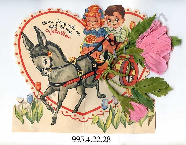 One printed colour greeting card with the message, "Come along with me and be my Valentine," and decorated with the image of two children riding in a cart being pulled by a small grey donkey. The image of the children is encircled with a large red heart border and colourful tulips along the bottom edge. To the card there has been added a three-dimensional pink flower which is attached through four holes in the card and tied with blue coloured thread. On the reverse of the card, hand written in black coloured pencil is the message, "To Miss Gamble from Darlene."