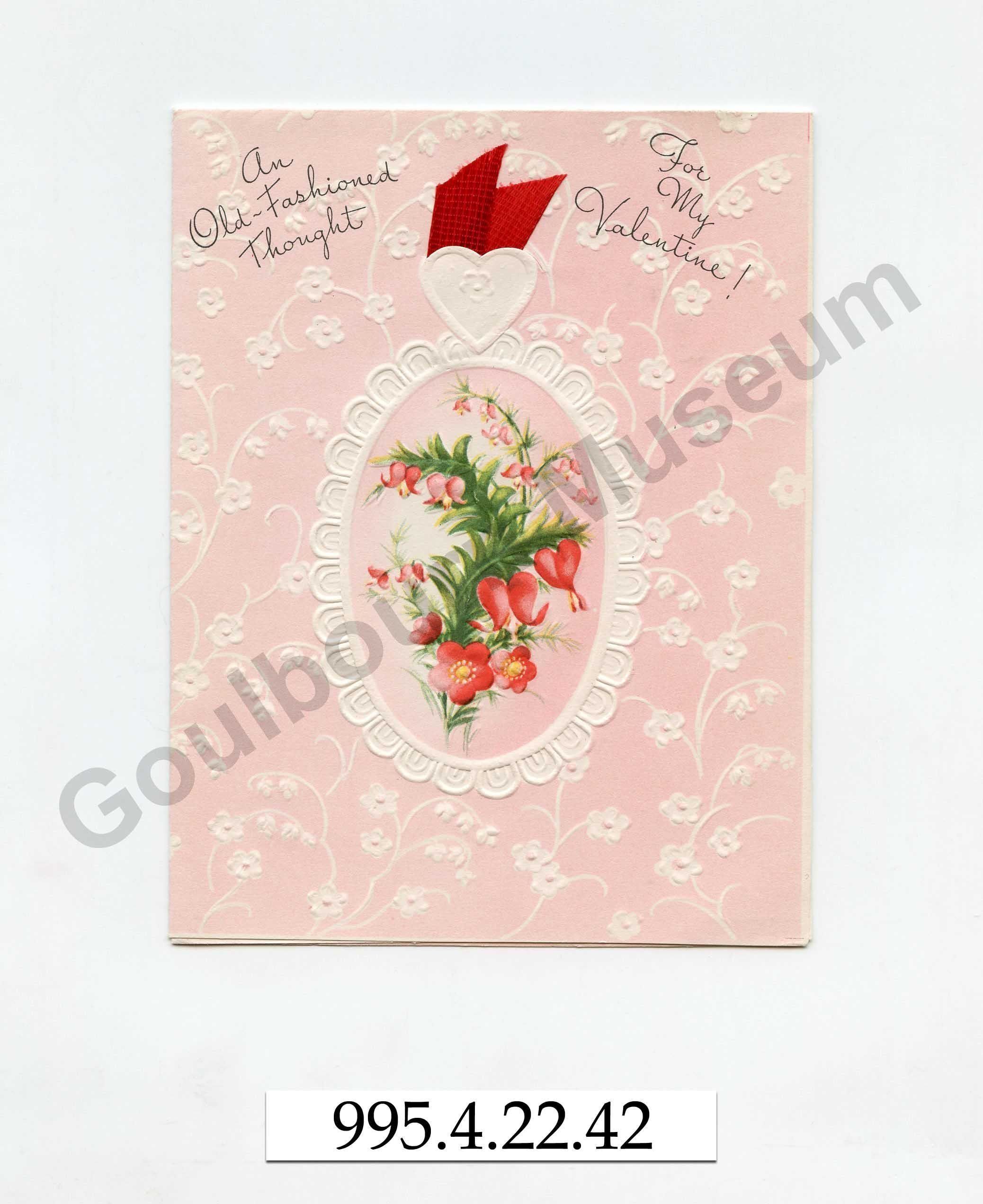 One pink and white imprinted greeting card with a water colour painting of flowers in the center and a white heart with ribbon coming out of the top. On the cover of the card is the message, "An Old-Fashioned Thought For My Valentine!". The inside of the card has a pink heart, on the proper right of the inside of the card, with white lace around the edge and a painting of flowers in the center an additional message "You're so sweet and thoughtful In all you say and do, There's not a single minute That I'm not loving you!" Written in blue ink "From Gilaine(SP?)".Context