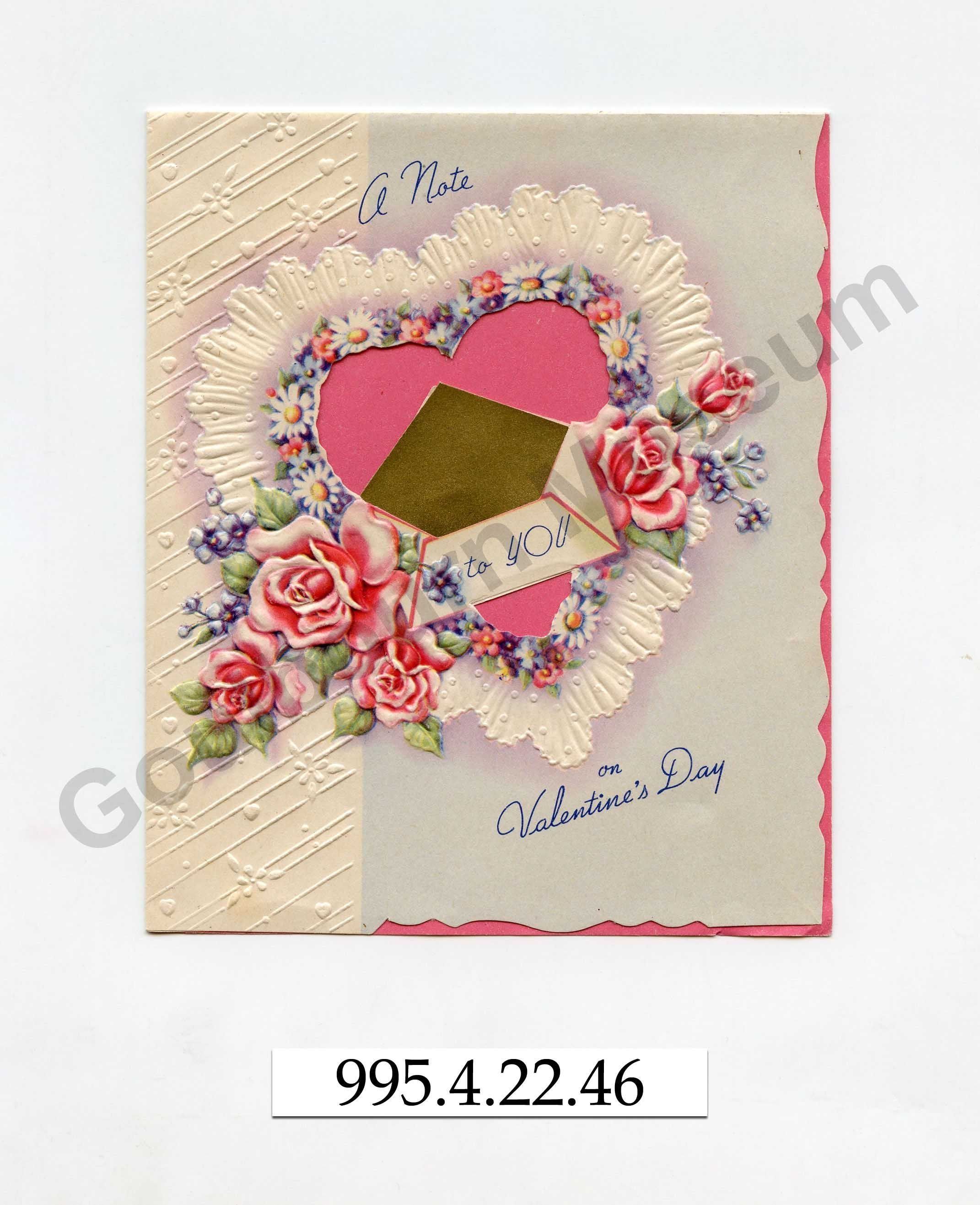 One white card with imprinted flowers and laces around the edge of a heart shaped opening with a gold square in the center and pink roses next to the square. A message on the cover reads "A Note to YOU on Valentine's Day". The inside of the card has an image of an envelope with flowers and text that reads "With Love". At the top of the proper right panel is a message "That you are my Valentine I hardly need to say -". At the top of the proper left panel is a message "You're first in my affection Today and EVERY-DAY! Written in black ink "To: Miss Gamble, From: Eleanor, Arnold + (Pest.) Howard Bergesen."