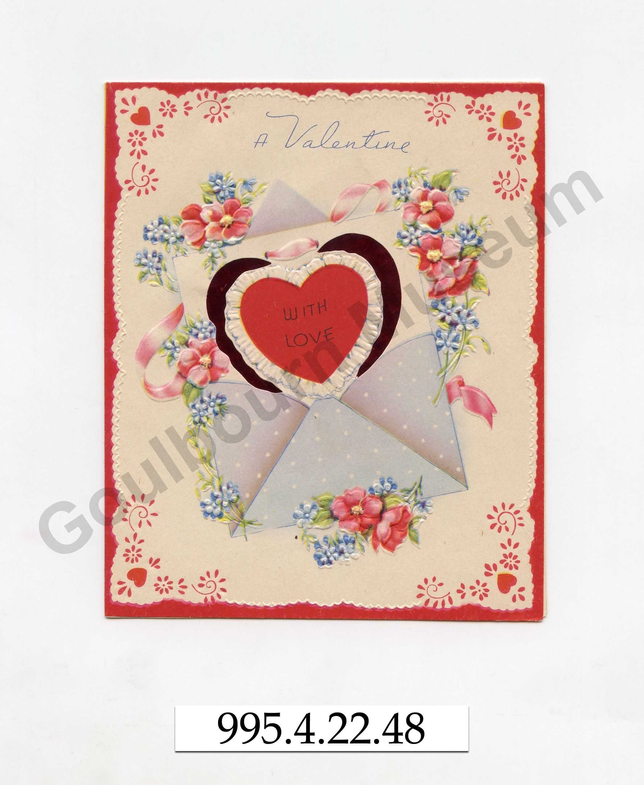 One white card with a red border and an envelope with a card inside that has a red heart in the center. Around the outside of the envelope are various pink and blue flowers. A message on the cover reads "A Valentine WITH LOVE". The inside of the card on the proper right panel is an image of a piece of paper with ribbon going through it and flowers and hearts in the center of the paper. At the top of the proper left panel the message continues " These blossoms come to tell you That you are very sweet, And have a way about you That is mighty hard to beat! Please 'note' their happy message So~ in days that are to be you will know exactly How dear you are ~ to me!" Written in black ink "your Ex pupil and same old Pal. Peggy.".