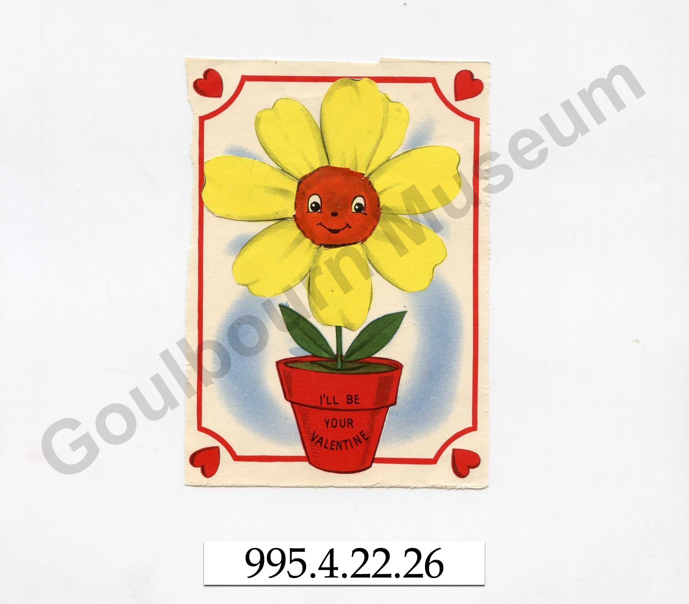 One printed colour greeting card with the message, "I'll be your Valentine," and decorated with a potted yellow flower surrounded by a red line and heart border. The yellow flower has seven petals, of which three have hidden messages under petals added on top of the surface of the card. The messages say, "Yes," "No," and "Maybe." The recipient would pull the petals out of the flower to reveal the message. On the reverse of the card, written in blue ink is, "From. Stanley."Context
