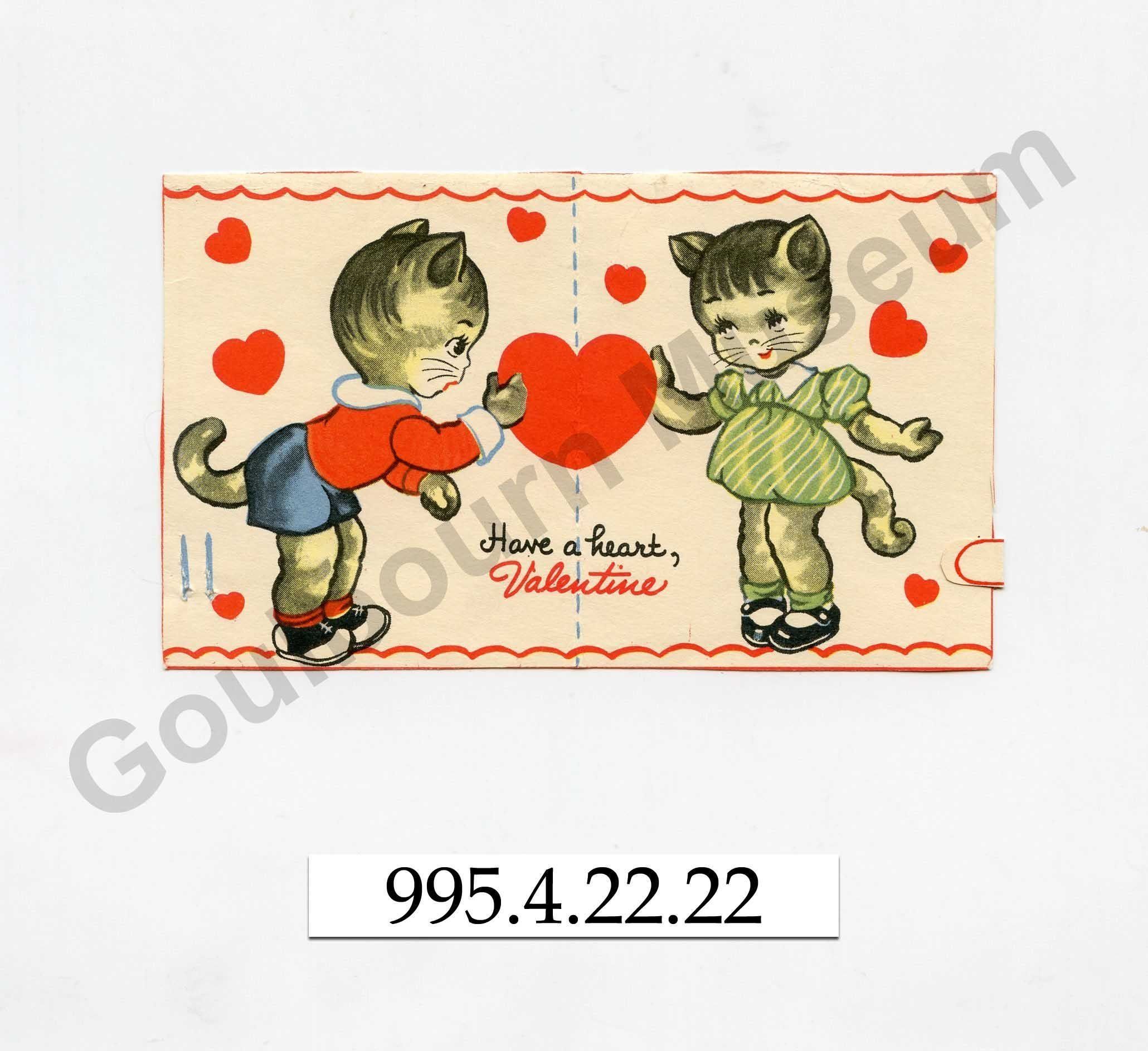 One folded paper greeting card decorated with three hearts and a floral decoration on the front cover. Inside the card are the images of two cat figures holding a heart shape between them. Along the bottom edge of the card is the message, "Have a heart, Valentine." On the reverse of the card, written in graphite pencil is the message, "To Teacher from Doris."