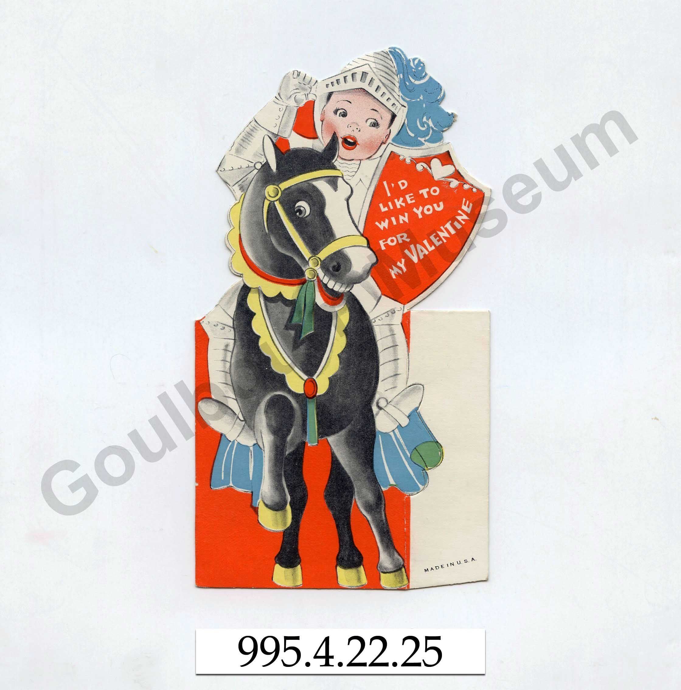 One printed colour greeting card with the message, "I'd like to win you for my Valentine," and decorated with a child, dressed in a suit of metal armour, riding a black and white horse. The bottom right corner of the card has an area that folds behind the card to serve as a stand. On the reverse of the card in black ink is written, "To Mary," "from Don & Betty Lou."Context