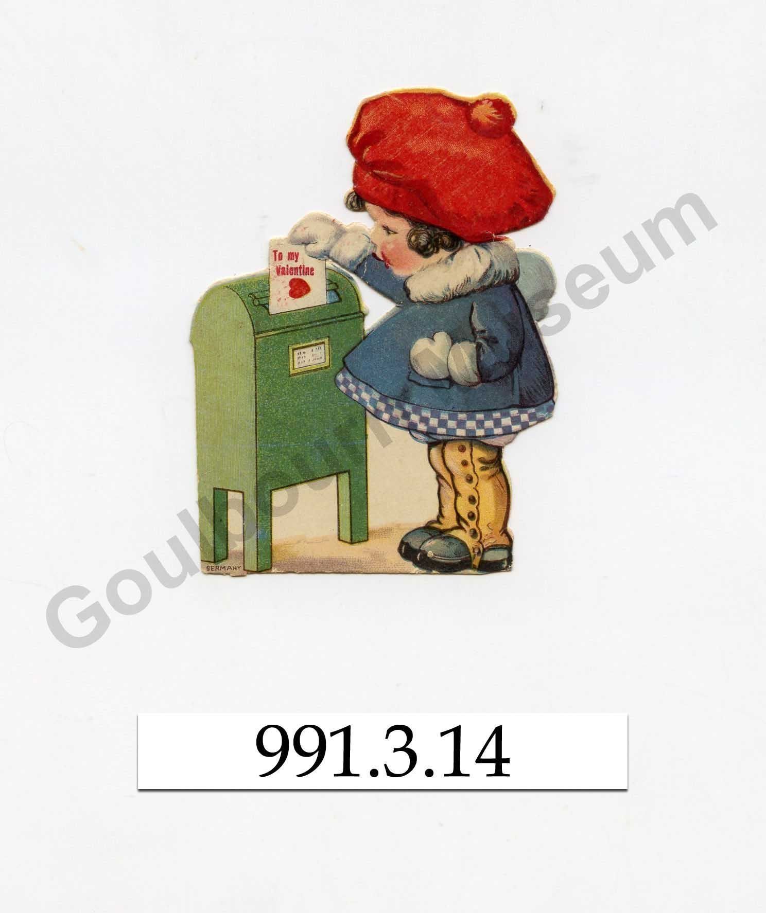 One colourful Valentines Day card of a little girl in a blue coat and red hat putting a Valentine's day card into a green mailbox. On the reverse side is a message " To Isabel From William".