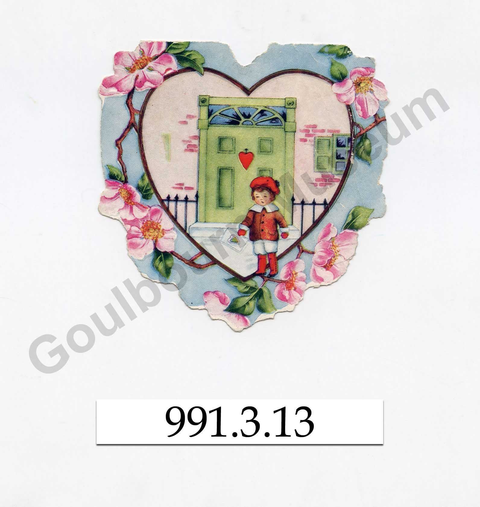 One colourful heart with pink flowers around the border. In the center of the heart is an image of child in a red hat, coat and boots holding a valentines card in front of a green door and a pink brick wall.