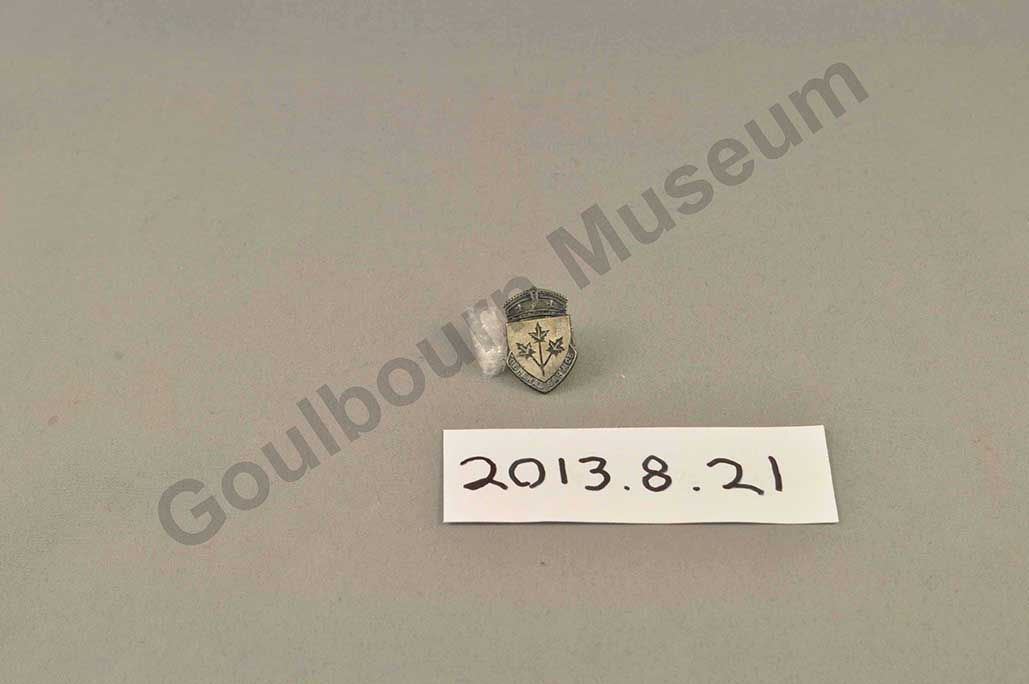 Sterling silver screw post pin consisting of a shield with three maple leafs joined by a single stem, with a crown above and a scroll below that reads: "General Service." This design is the second of two proposed designs for the War Service Badge: Service Class, a badge established by W. Duff, Canada's Administrator in Council, in 1940 for members of the military, air force, and navy who had been honourably discharged from service. The reverse contains a serial number (399443) and text that reads: "PENALTY FOR MISSUSE 500 DOLLARS OR SIX MONTHS IMPRISONMENT."Lexicon