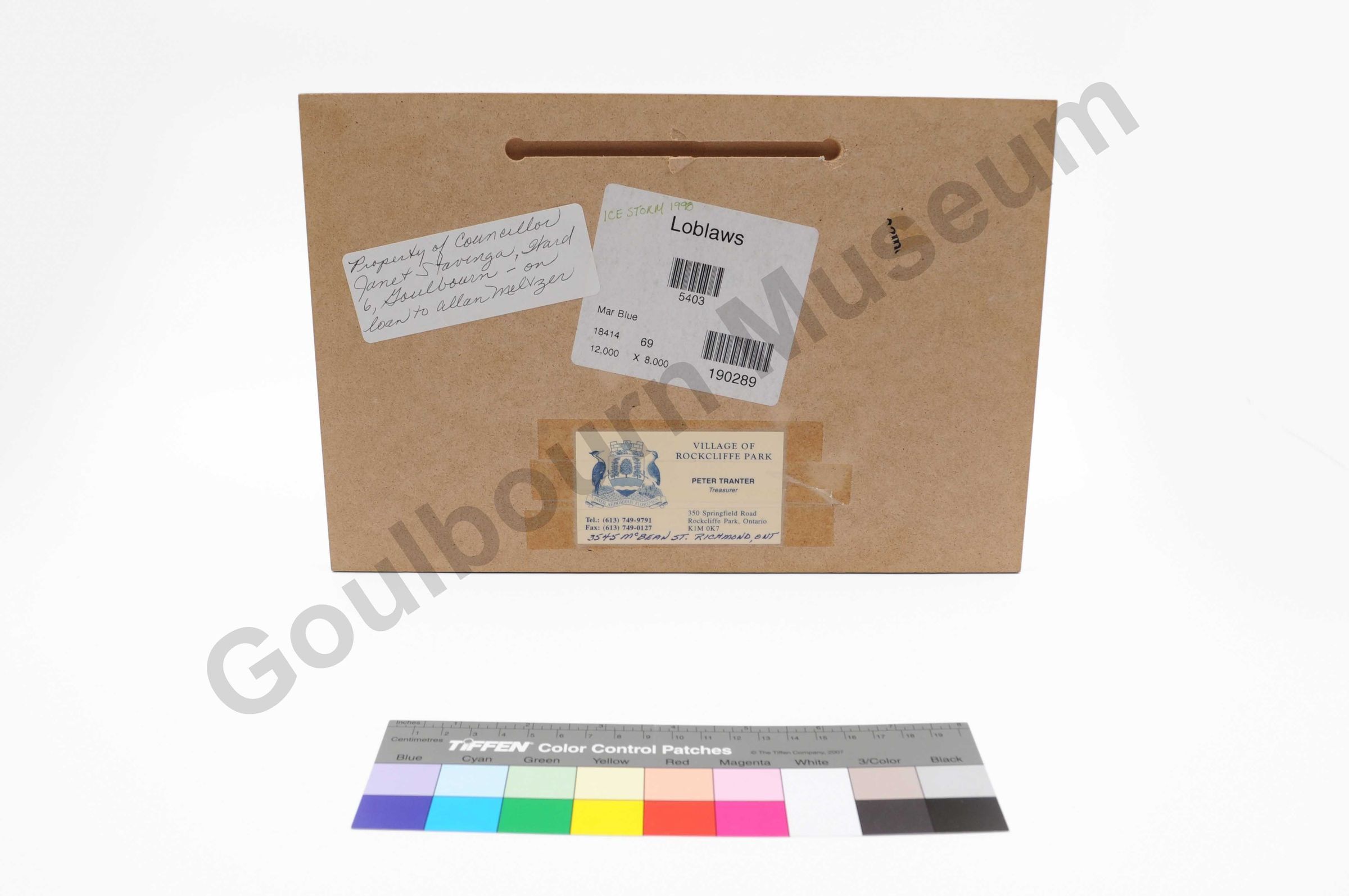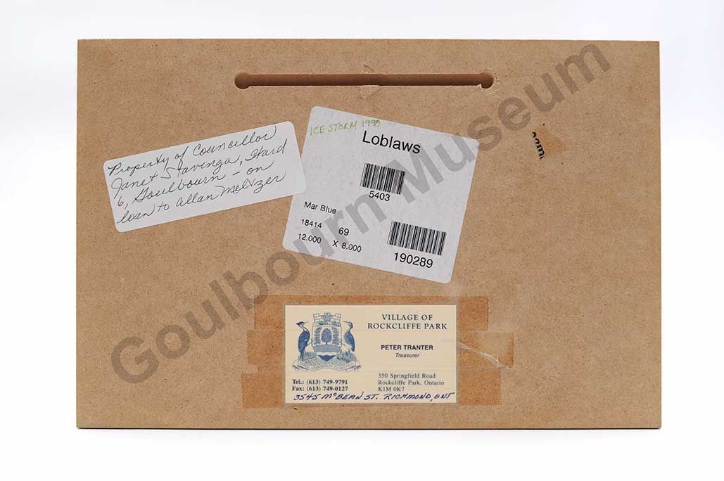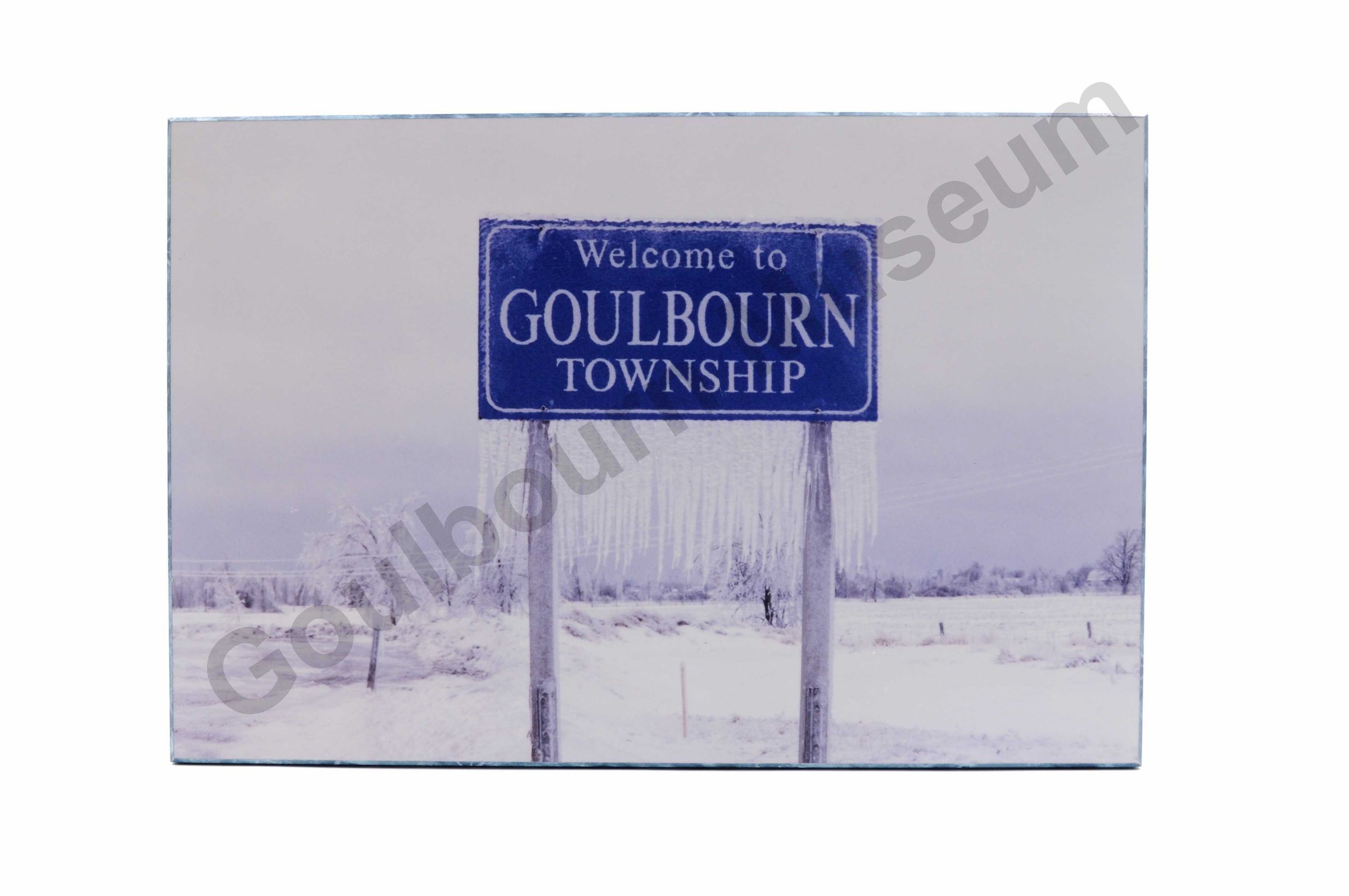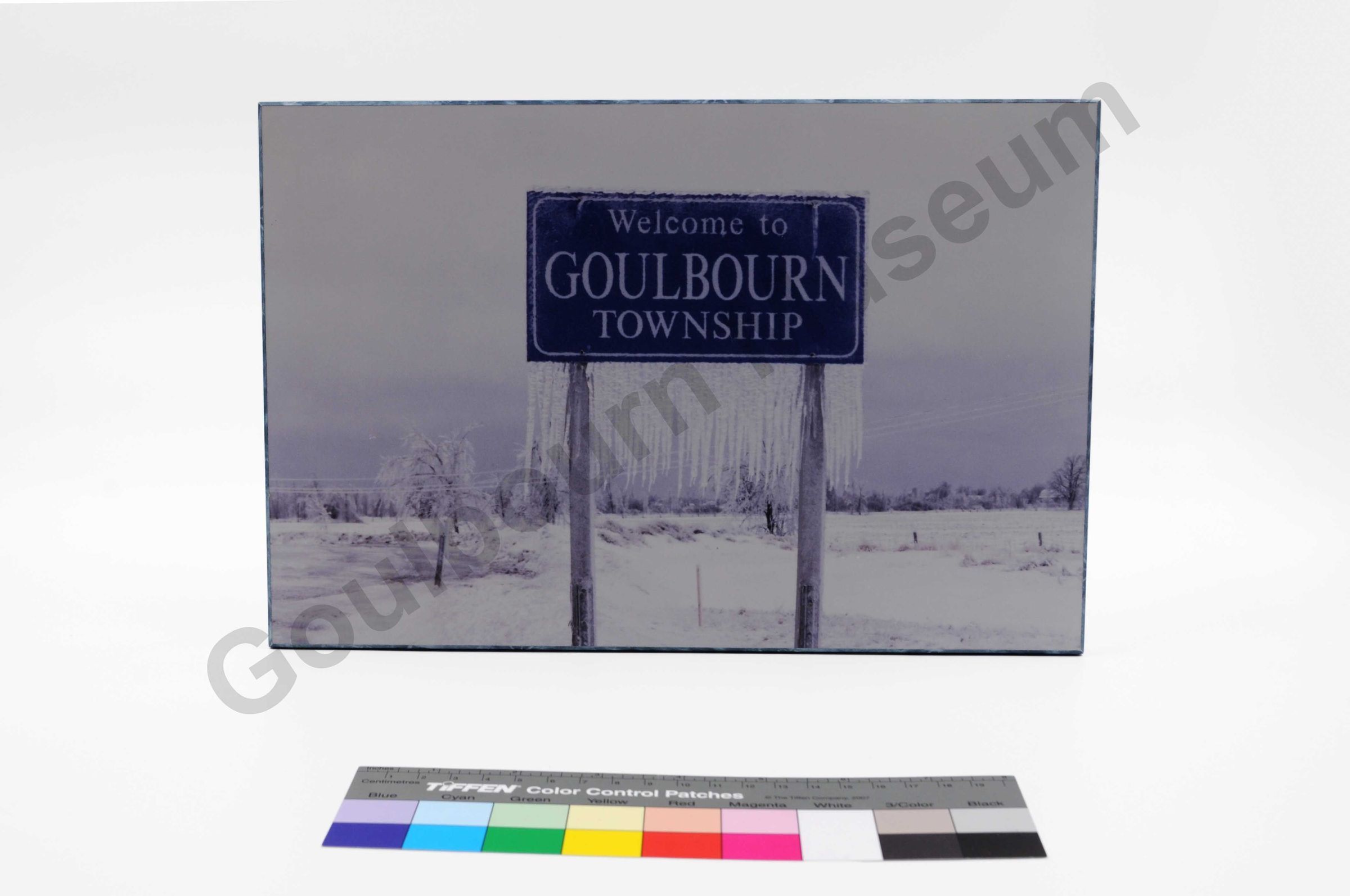 This item is a rectangular colour printed wall art of the photographed image of Goulbourn Township sign during the Great Ice Storm of 1998. This image is printed onto a wood backing. The image on the front is of the sign for Goulbourn Township, reading, "Welcome to Goulbourn Township" with a wintery background. Attached and hanging down from the sign is thick ice. On the reversed side of the item is a carved out slot, running horizontal, for the item to be hung on a surface. On the back is also three pieces of stickers/paper, adhired to the wood. In the center of the item is a sticker label with the printed words "Loblaws" followed by a barcode and the numbers 5403. In the top corner of this sticker label in light green pen in all caps is "ice storm 1998". Beside this sticker label is a thin rectangular sticker label with cursive black pen written on it, reading, "Property of Councillor Janet Stravenga, Ward 6, Goulbourn - on loan to Allan Melvzen." Along the bottom edge of the back of the item is a taped down rectangular calling card belonging to Peter Tranter - Treasurer of Village of Rockcliffe Park. Followed by the individuals address and contact information.Artwork Details