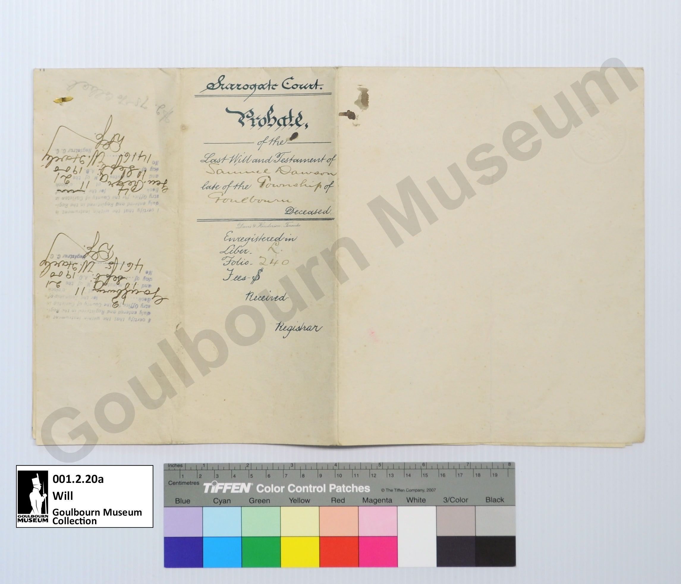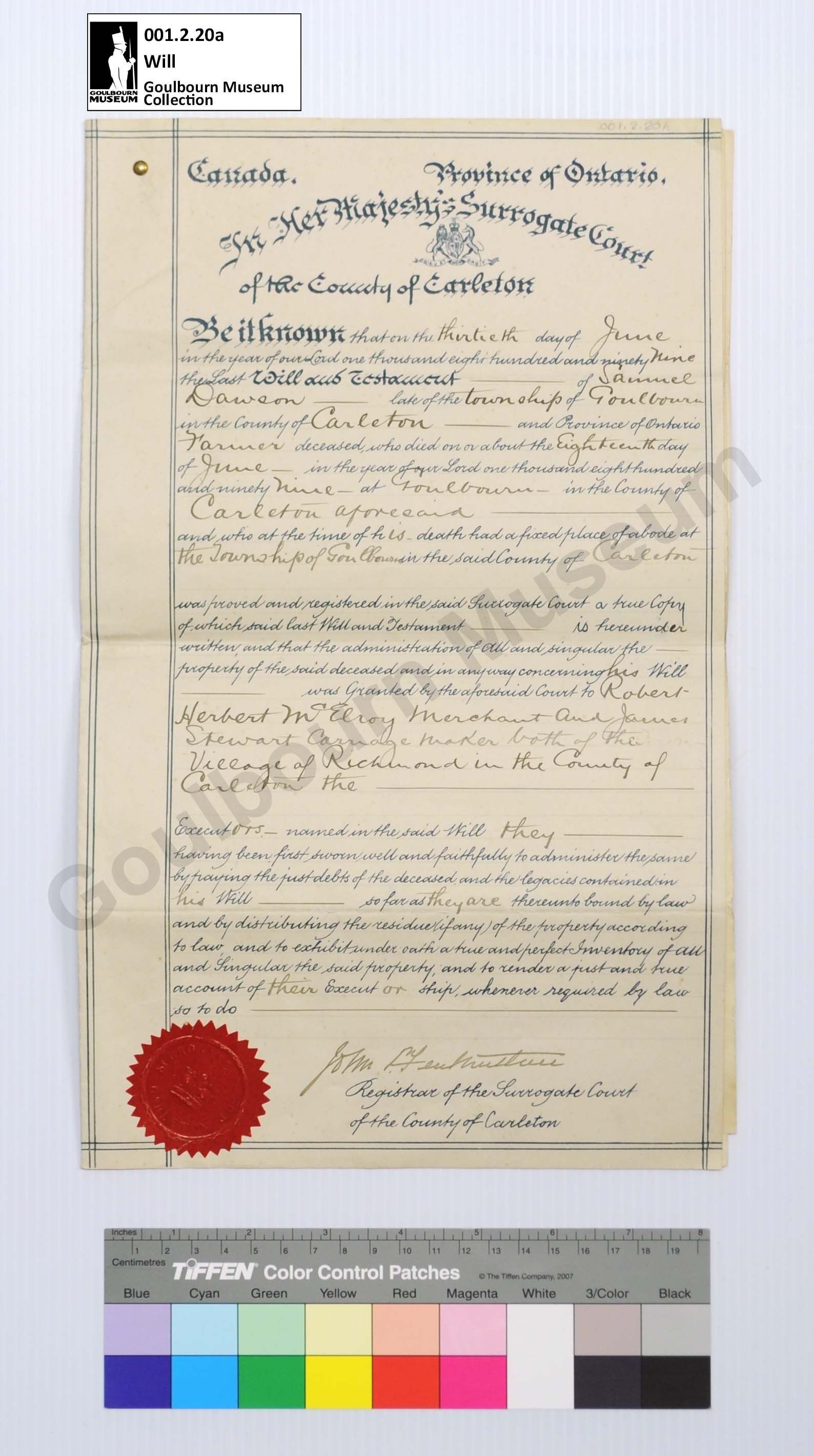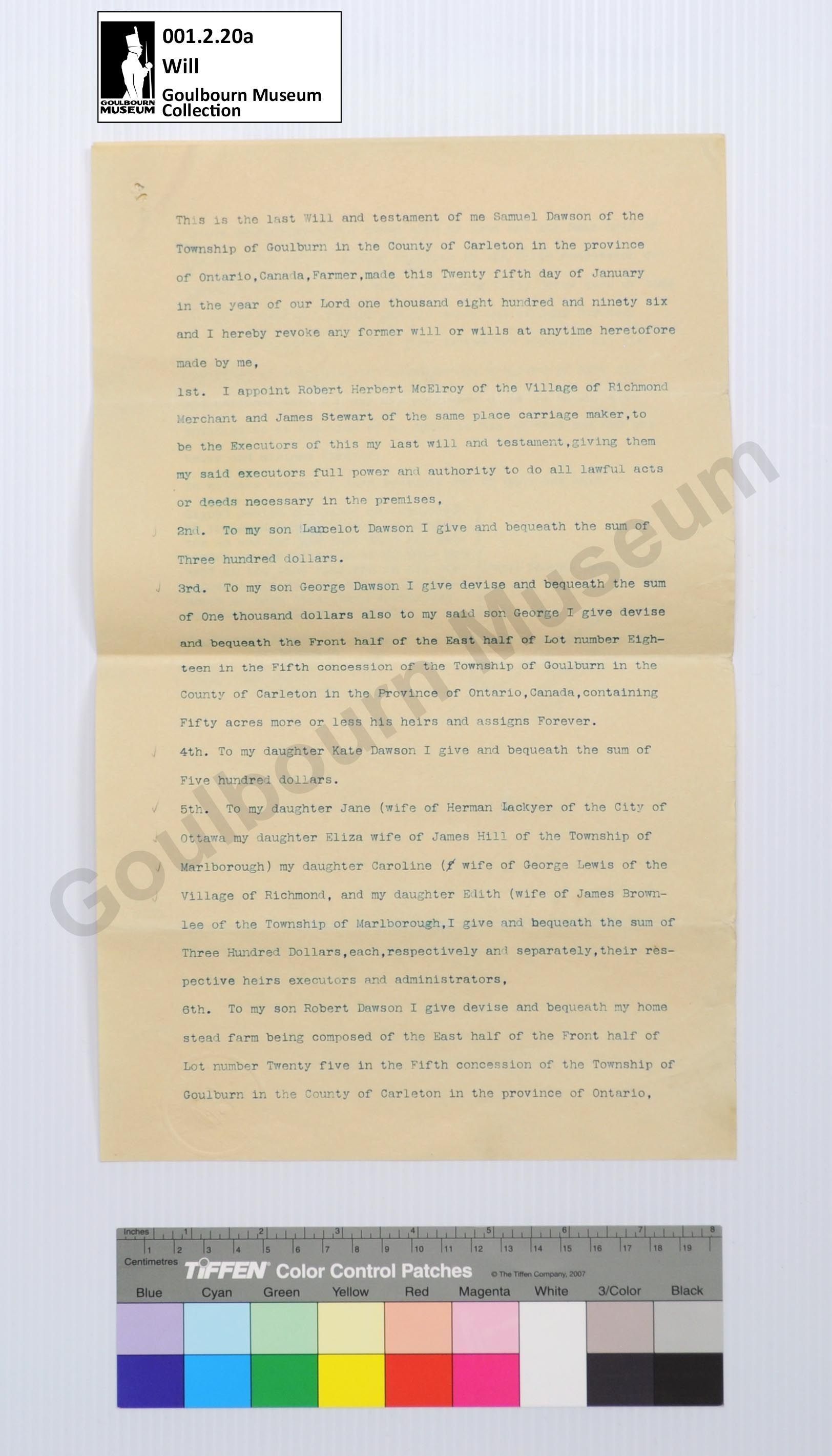 Will: Samuel Dawson, Goulbourn Township, 1899Entry/Object ID