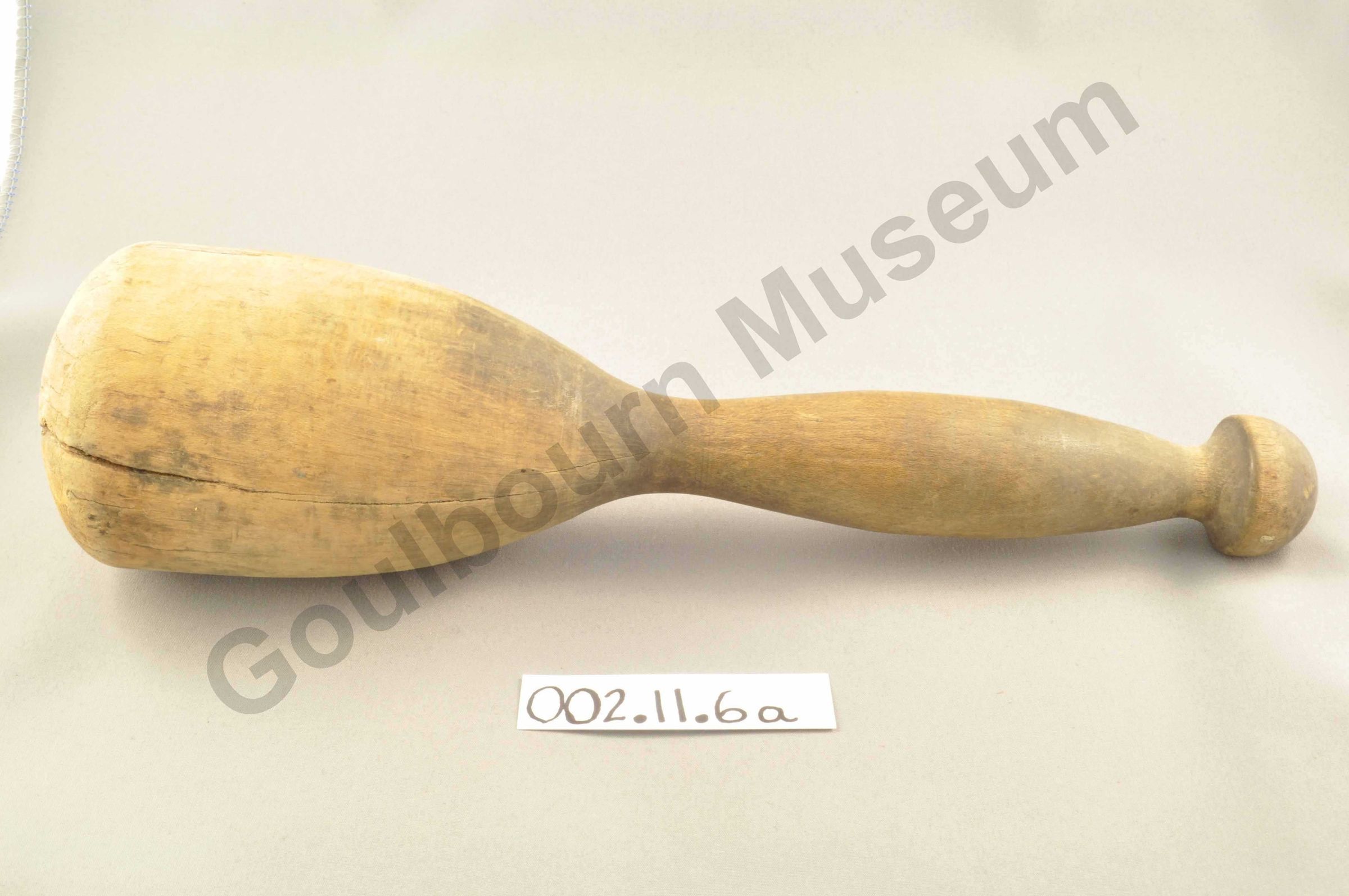Wooden kitchen pestle with rounded tip, undulating handle and curved crushing surface.