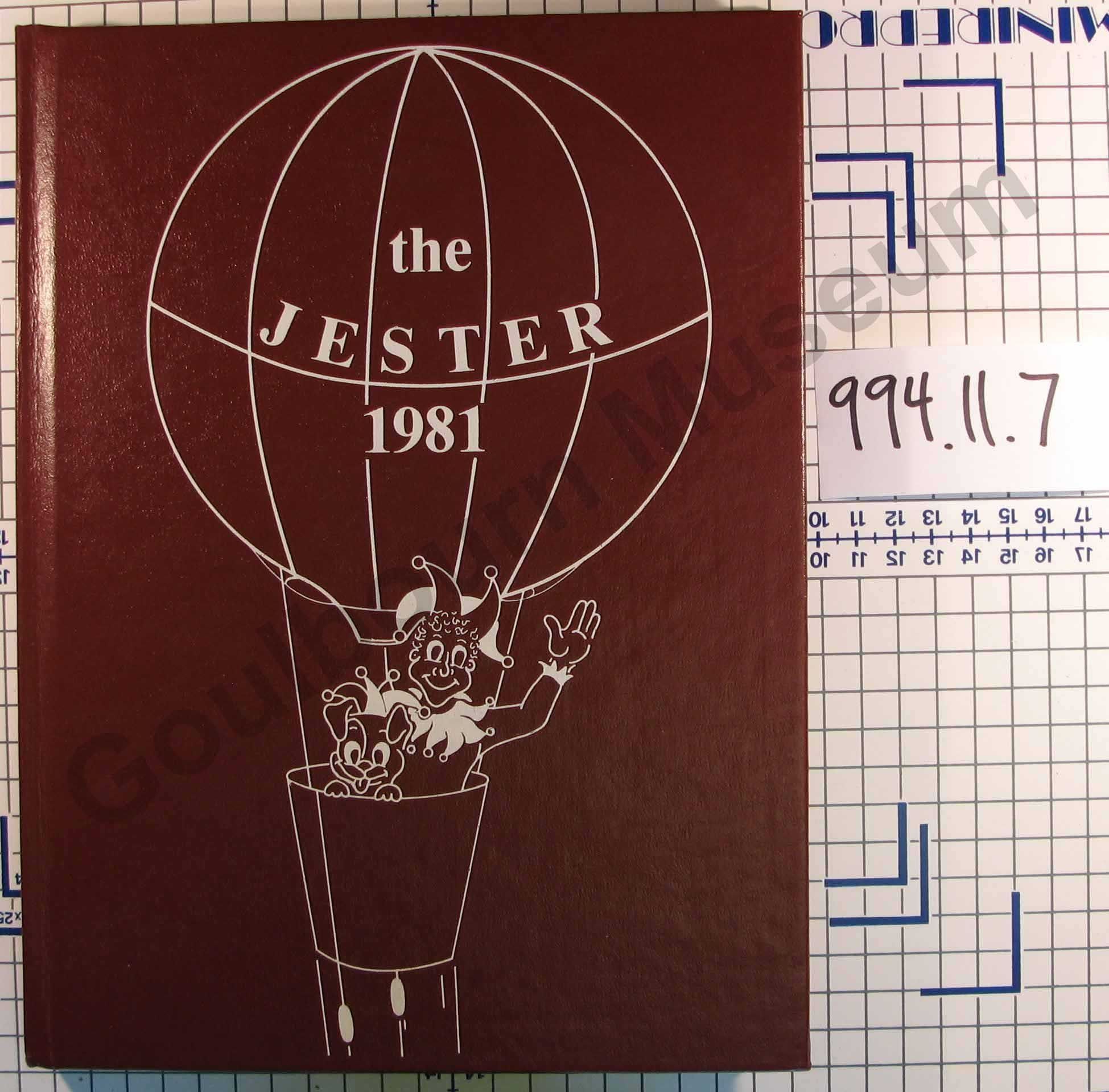 1981 yearbook from South Carleton High School. The front cover contains a depiction of a jester and a dog in a hot air balloon; "The Jester 1981" is written above in white lettering.