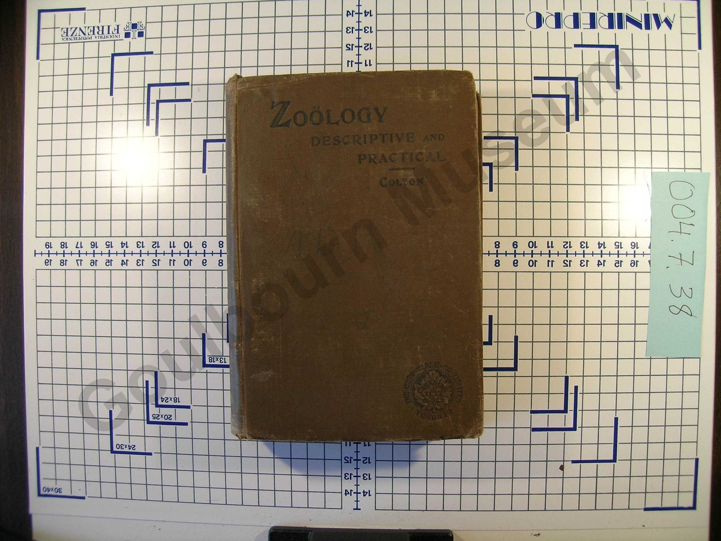 Brown book with black text which reads "Zoology. Descriptive and practical".