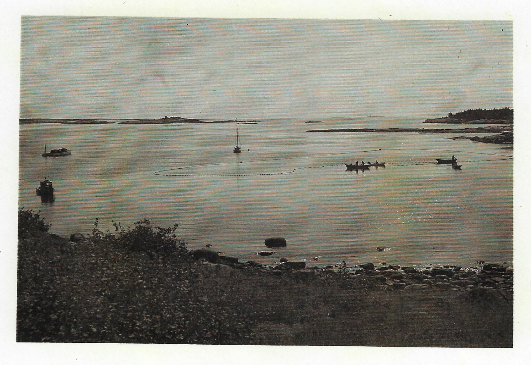 Fishing in Corea, Maine harbor. Outer Bar Island on the left. Wild flowers along the shore.Photograph Details