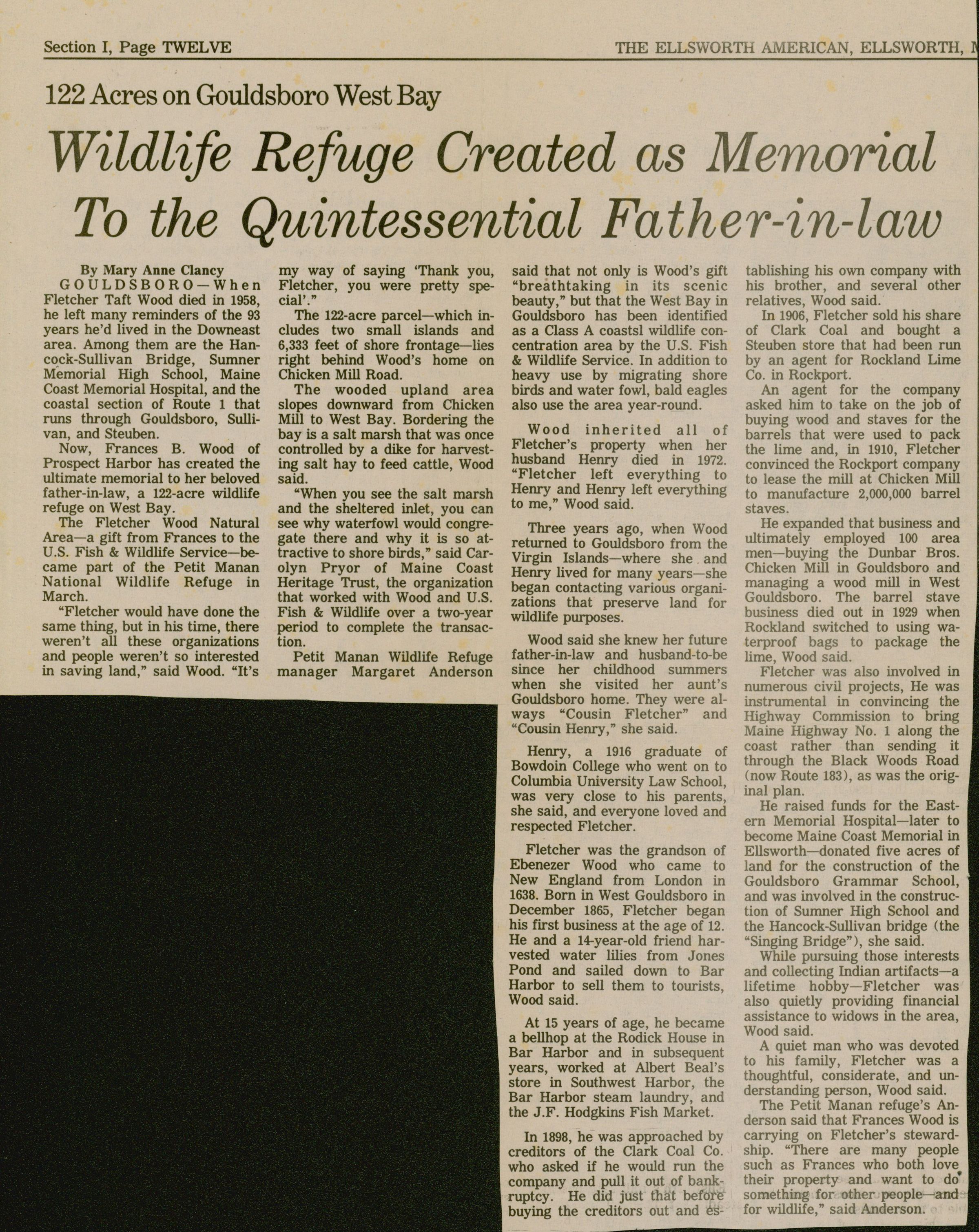 Frances B. Wood donates 122 acres on West Bay to the U.S. Fish and Wildlife Service in honor of Fletcher T. Wood.Relationships