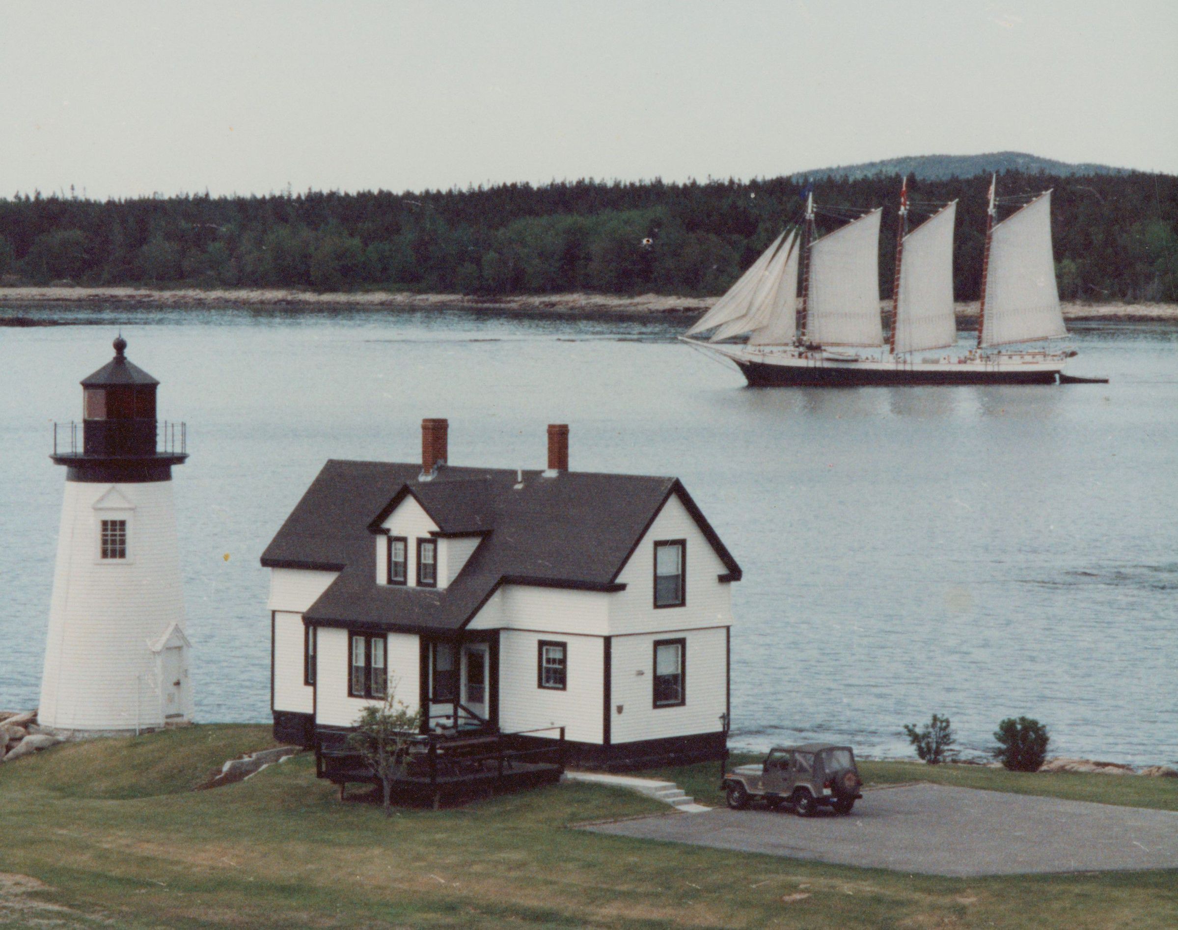 Prospect Harbor Lighthouse and Keeper's Cottage with Victory Chimes Schooner in the background.Entry/Object ID