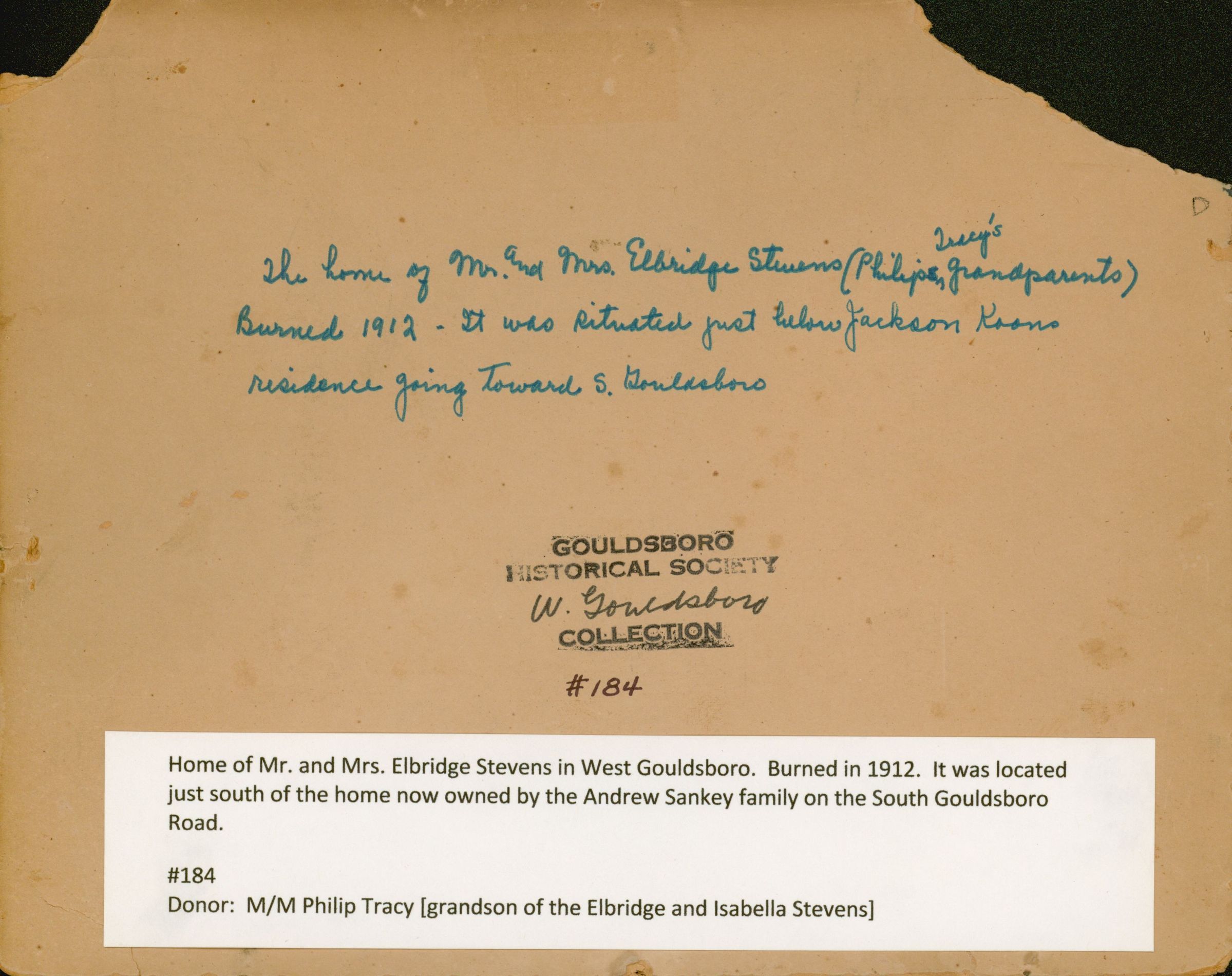 Home of Elbridge and Isabella Stevens. Burned in 1912. It was situated just below the Jackson Koons residence going toward South Gouldsboro. Later owned by the Andrew Sankey family.Photograph Details
