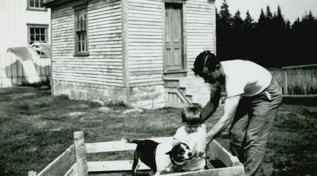 John and Gordon Workman, Sr. with their dog, Pal, outside of the Prospect Harbor Lighthouse.Entry/Object ID