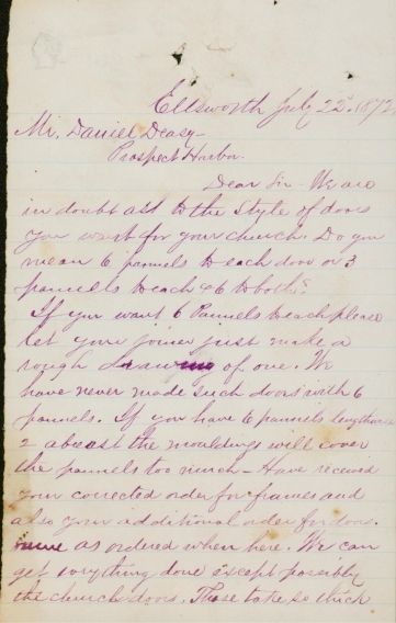 Letter to Daniel Deasey from J. D. Hopkins regarding the type of doors needed for the new church building in Prospect Harbor, Maine.Subject Person/Organization