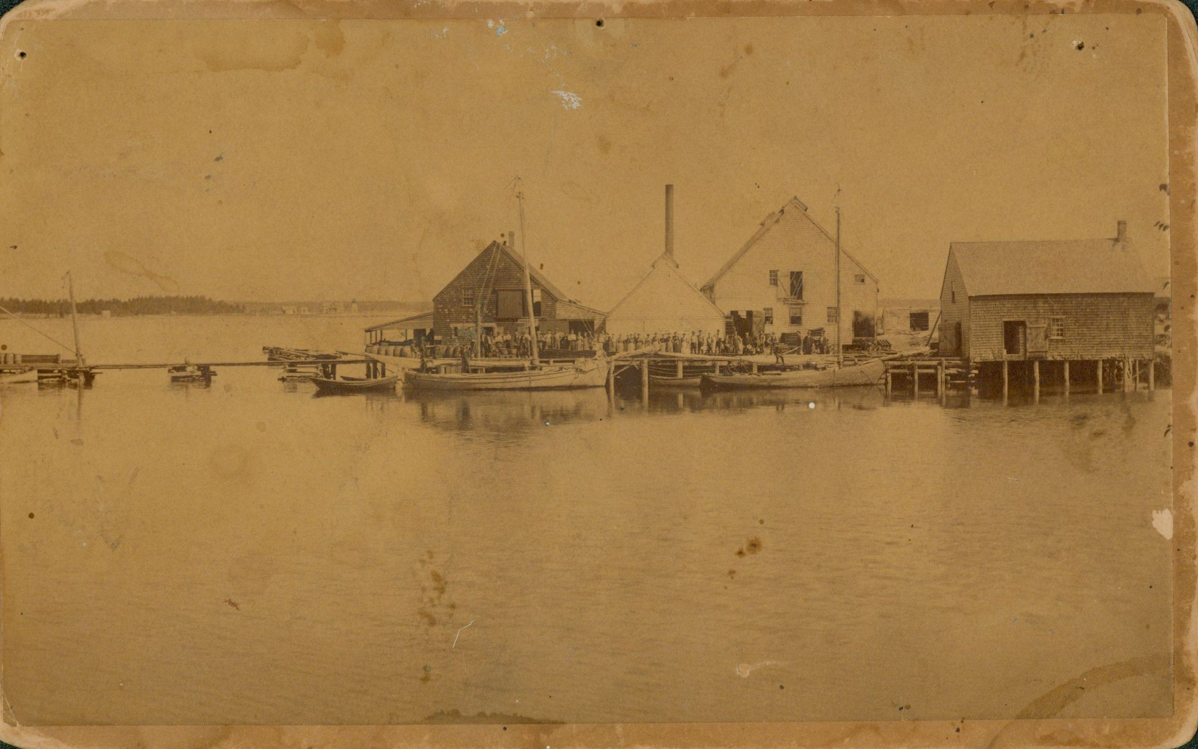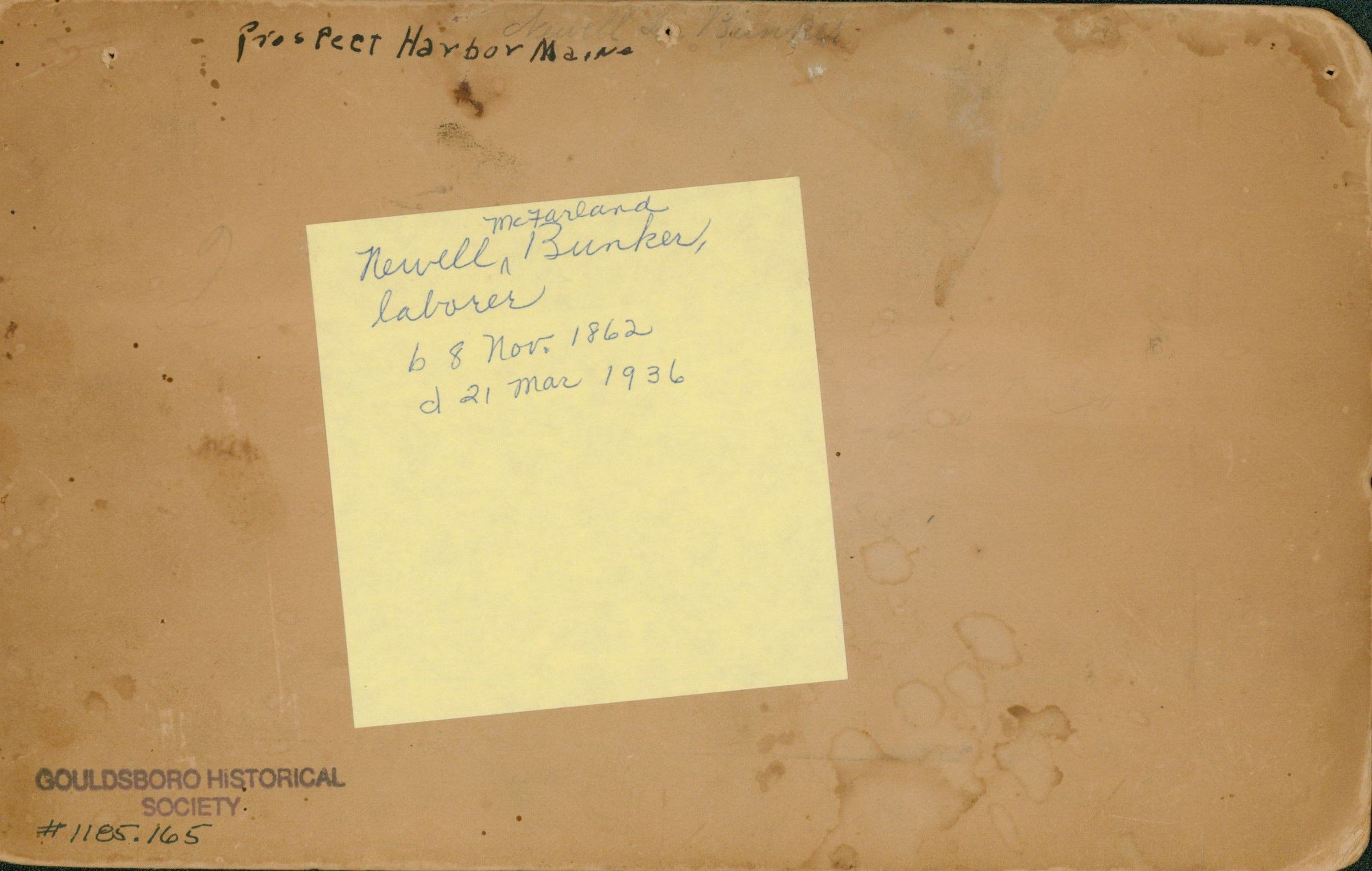 Crew on the Wharf at Prospect Harbor. Perhaps Newell Bunker is in the photo. See notes on back.Photograph Details