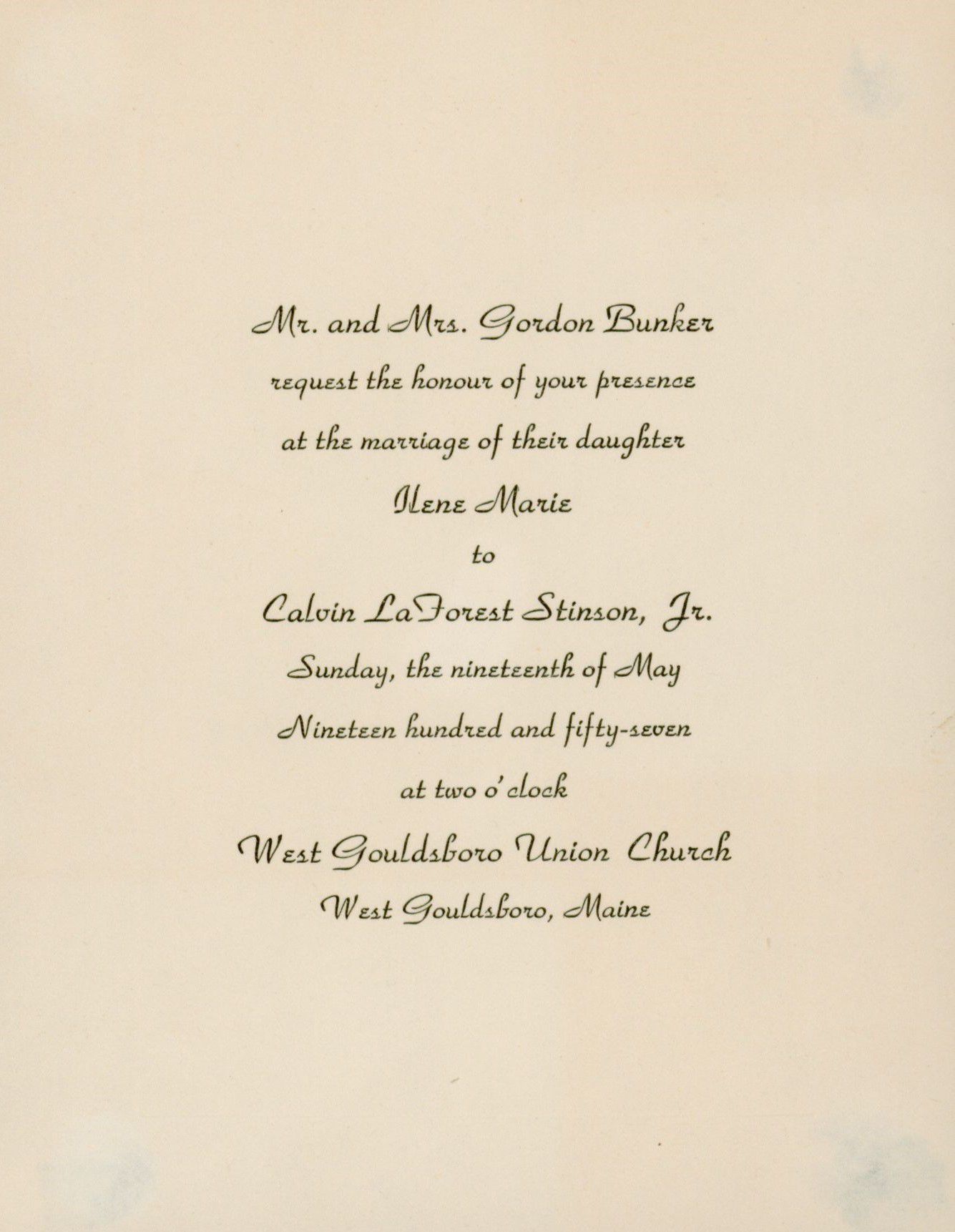 Wedding Invitation for Ilene Bunker and Calvin Stinson, Jr. at the West Gouldsboro Union Church on May 19, 1957.