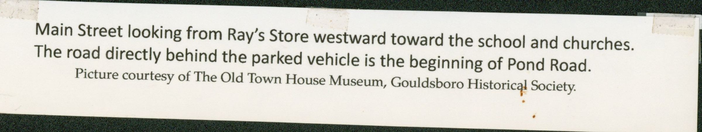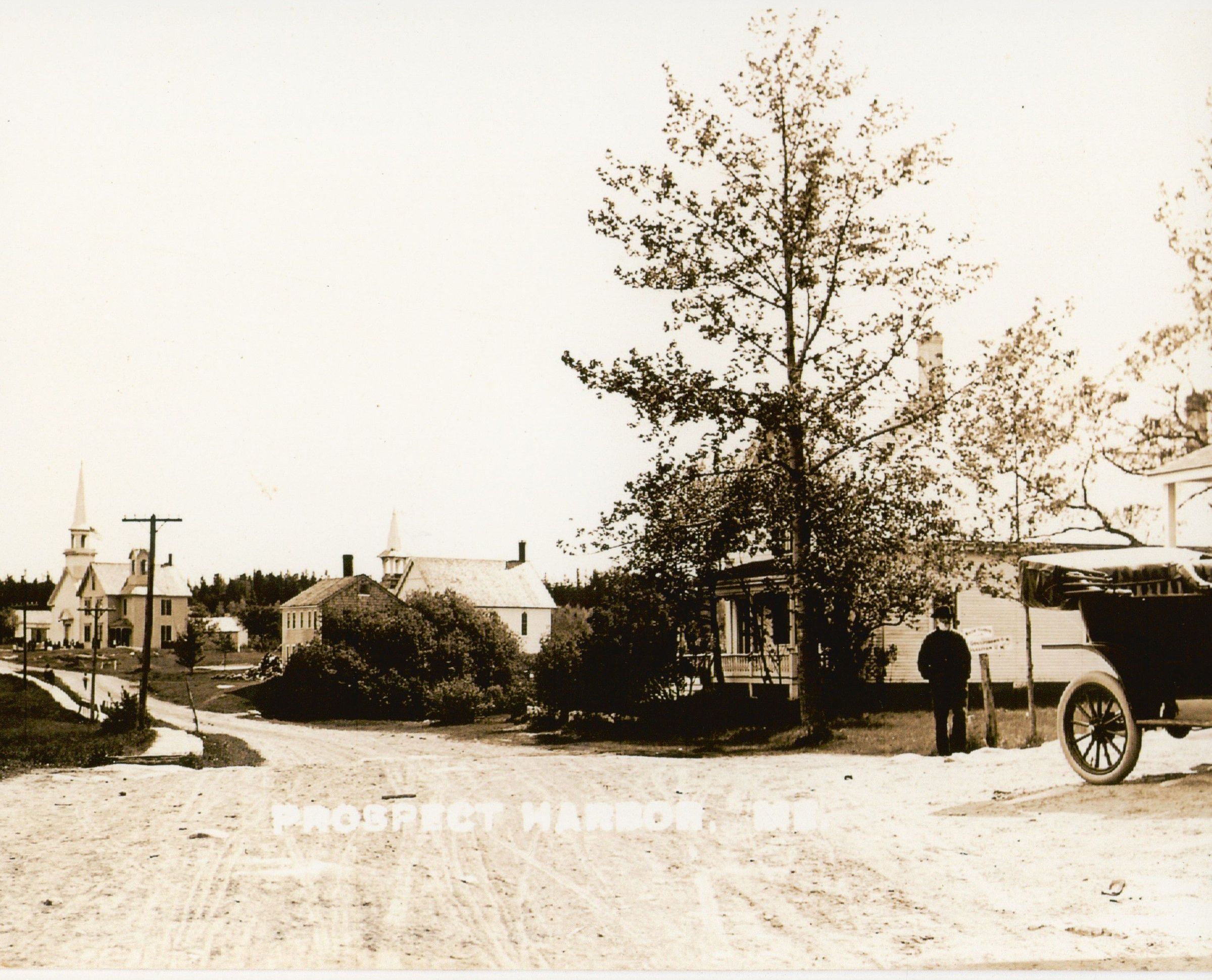 Prospect Harbor, ME. Main Street looking westward toward the churches and school. The road directly behind the vehicle is the beginning of Pond Road.Photograph Details