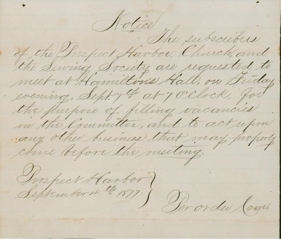 Meeting Notice for Prospect Harbor Union Church regarding election of officers.Subject Place