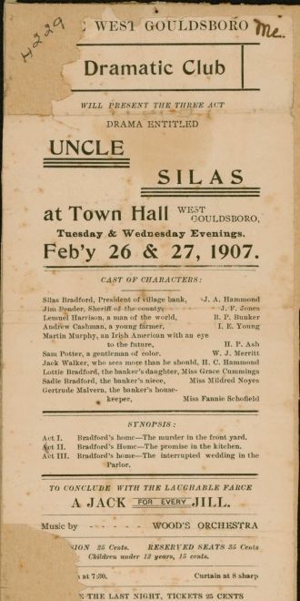 West Gouldsboro Dramatic Club Program for "Uncle Silas" production performed at the Gouldsboro Town Hall on February 26 and 27, 1907. Includes the names of the cast. Admission 25 cents. Reserved seats 35 cents.Update Date