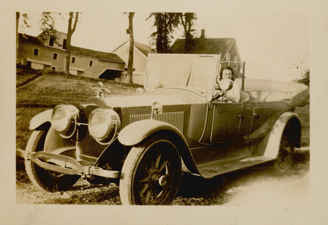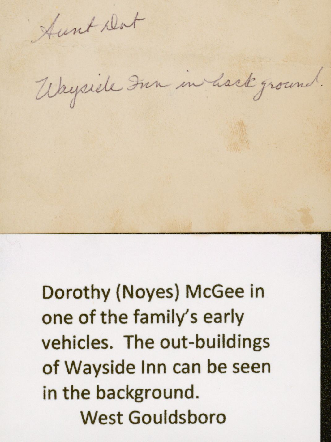 Dorothy Noyes McGee driving a car. The out-buildings of the Wayside Inn are in the background.Photograph Details