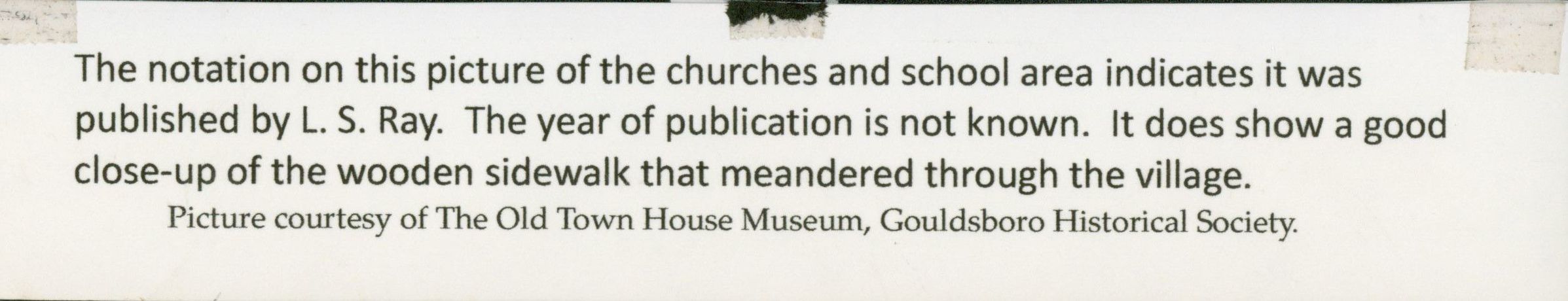 View of the wooden side walk along Main Street. Large building in the center is the grammar school. Circa 1925.Photograph Details